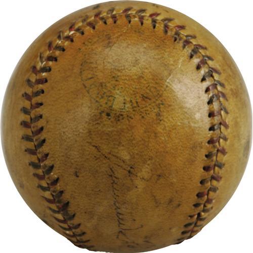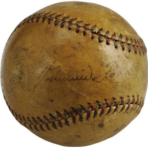 <B>Circa 1929 Jimmie Foxx Single Signed Baseball.</B></I> The second man to earn a key to the 500 Home Run Clubhouse is also the second toughest single of the group, with only the short-lived Mel Ott a scarcer commodity. This specimen will carry particular weight with serious collectors for its placement upon a pre-1934 OAL (Harridge) sphere. The red and blue stitching of the ball, and the placement of Harridge's facsimile signature on the eastern panel allows us to definitively date the ball to the first half of Double-X's Hall of Fame career, around the time he was powering the Philadelphia Athletics to three consecutive American League flags. Foxx' black fountain pen signature, just to the west of the ball's sweet spot, rates a fine 7/10, aided to some degree by an ancient coating of shellac that has given the ball a tobacco shade. With most Foxx solo balls dating to his post-playing days, one from the time of his greatest diamond exploits is a rare sight, and a genuine treasure for the baseball historian. <I>LOA from PSA/DNA. LOA from James Spence Authentication.</B></I><BR><BR><b>Shipping:</b> Balls, Pucks, etc., Small (<a target="_blank" href="http://www.heritageauctions.com/common/shipping.php">view shipping information</a>)
