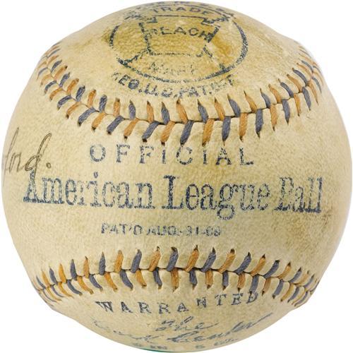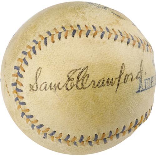 <B>Circa 1915 Sam Crawford Single Signed Baseball.</B></I> A devastating combination of power and speed elevated "Wahoo Sam" to the top of the career charts for triples with a total of 309, fourteen better than his closest rival and Hall of Fame teammate Ty Cobb. Much like Gehrig's experience with Ruth, Crawford often found himself in the shadow of the more famous Tiger, and his single signed baseballs are rarely seen within the hobby. Of the thin supply, only a tiny handful date to the pre-war era as does this gorgeous Official American League ball in the style used from 1910 to 1925. The gorgeously applied black fountain pen side panel signature rates a stunning 10/10, a simply unimprovable example with only a single pinprick to the leather at the letter "m" that is really too minor for mention. Scattered toning is completely uniform on the panel housing the signature, making for an ideal display. Arguably the finest Crawford single in the hobby. <I>LOA from James Spence Authentication.</B></I><BR><BR><b>Shipping:</b> Balls, Pucks, etc., Small (<a target="_blank" href="http://www.heritageauctions.com/common/shipping.php">view shipping information</a>)