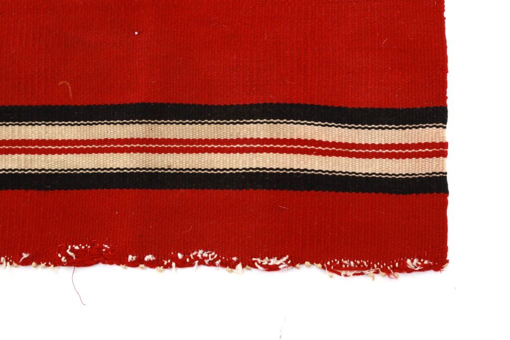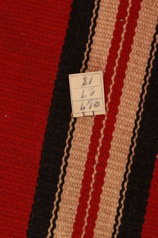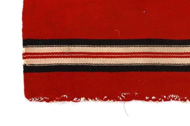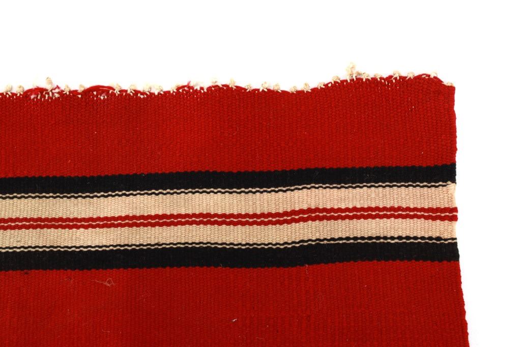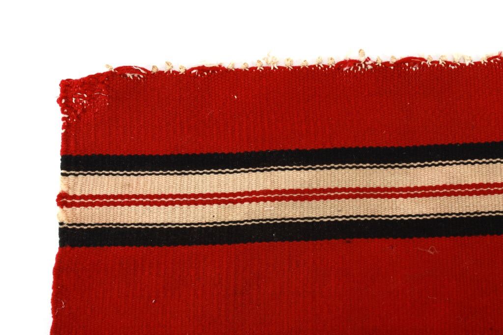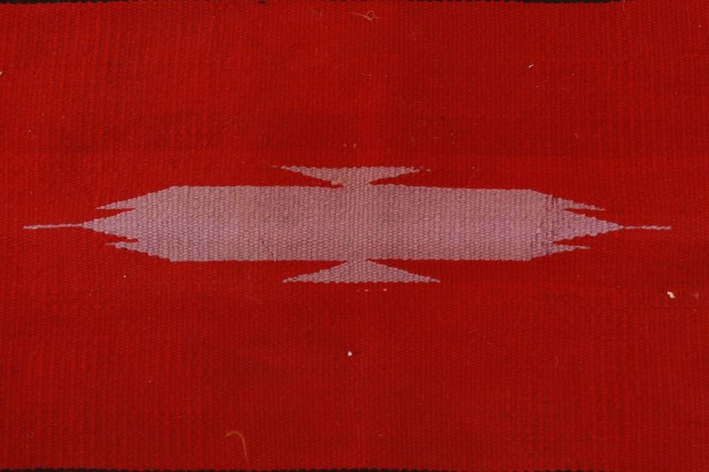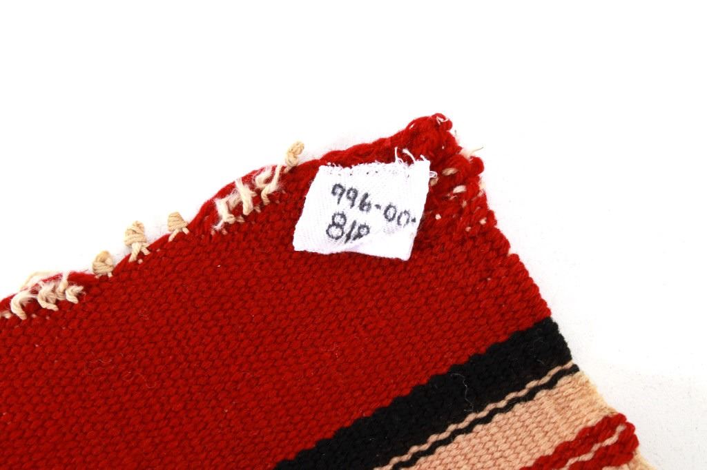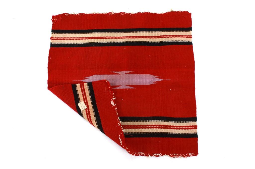 The lot features a circa 1930’s Mexican Saltillo sampler weaving rug. The weaving shows a nice tight weave with colors of red black, cream / light tan, and light purple, all of which are aniline dyes. The condition of this rug is preserved with some wear tot he weave throughout the rug with the corners showing wear to the edges but otherwise shows a preserved overall condition. The measurements of this salesman sample rug is 19" x 19 1/4". The thread count is 180 threads per square inch.