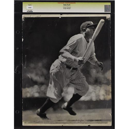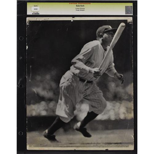 <B>Circa 1932 Babe Ruth Oversized Culver Service Photograph.</B></I> Handwritten pencil notation on verso, joining "Culver Service" stamping, entitles this piece as "Babe Ruth Taking Off." Appropriately named, the image captures the Babe exiting the batter's box, his eyes following the high flight of what is almost certainly a home run shot. Wear and minor creasing is confined almost entirely to the outer edges, leaving the central focus largely unblemished. 11x14". Confirmed as "Type 1" by PSA/DNA. CGC grade: Good.<BR><BR><b>Shipping:</b> Flat Material, Large (<a target="_blank" href="http://www.heritageauctions.com/common/shipping.php">view shipping information</a>)