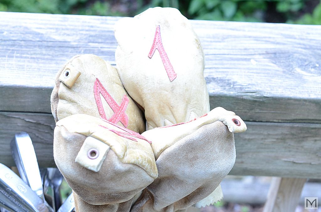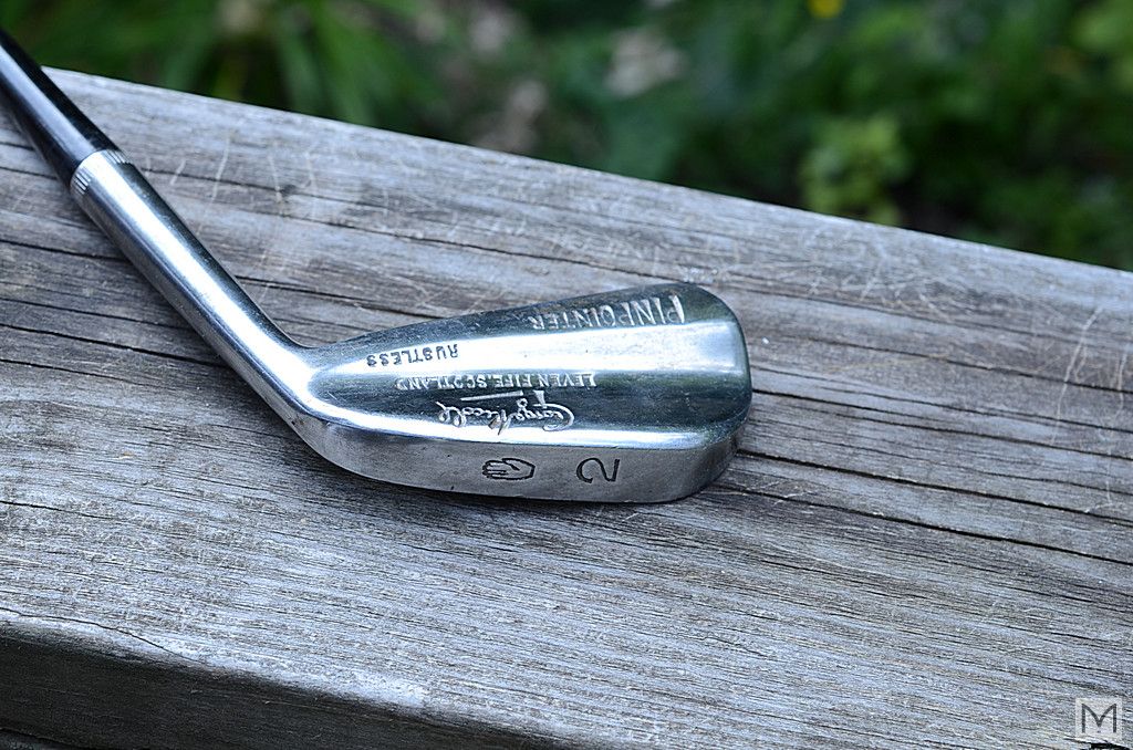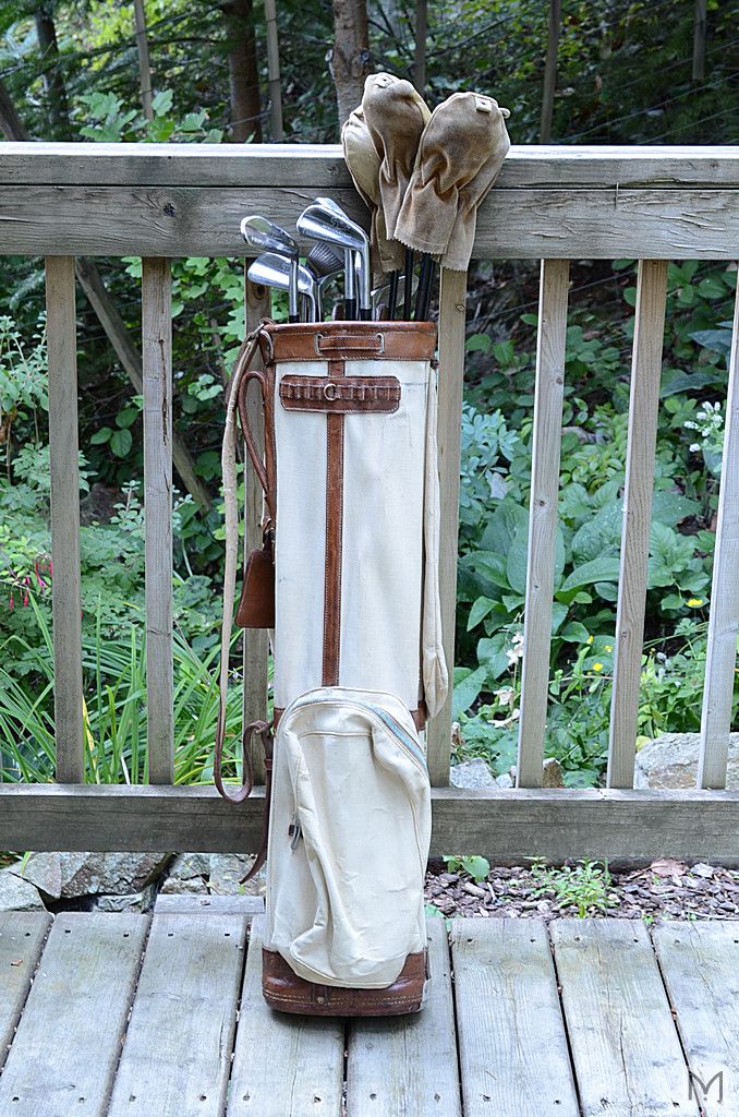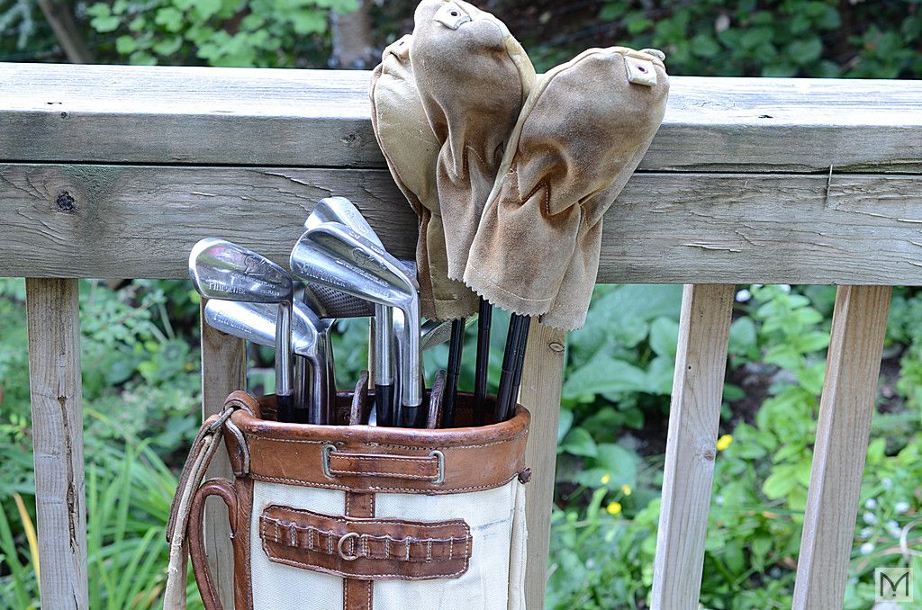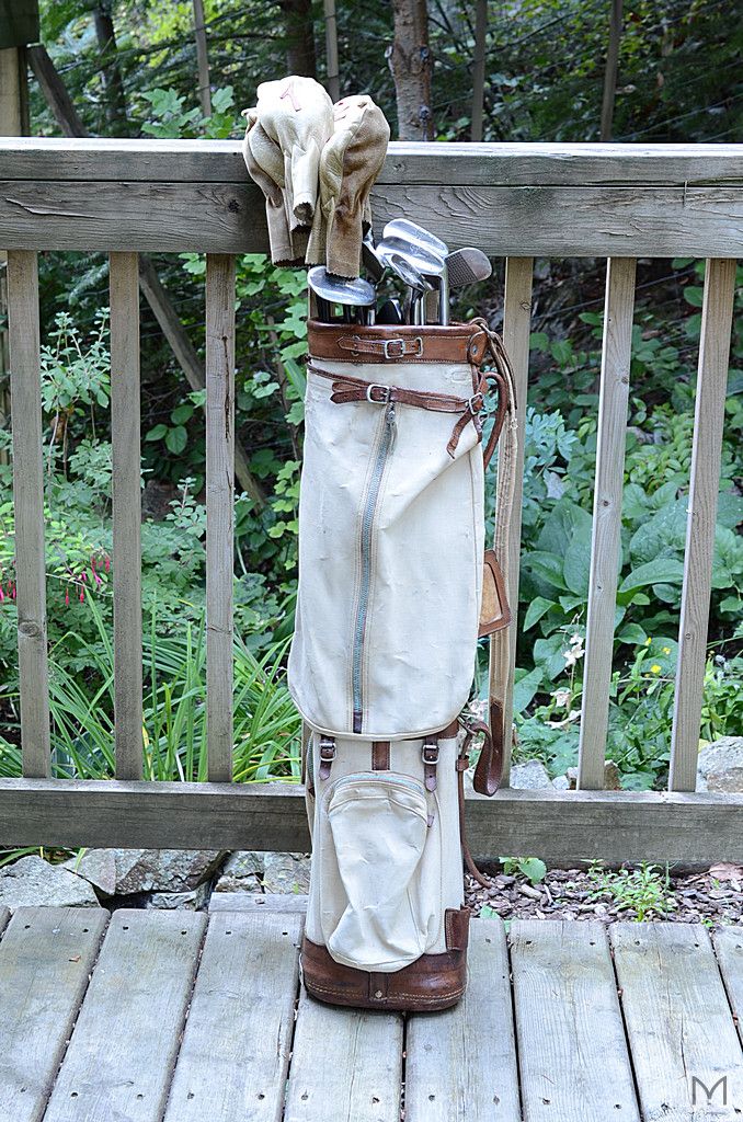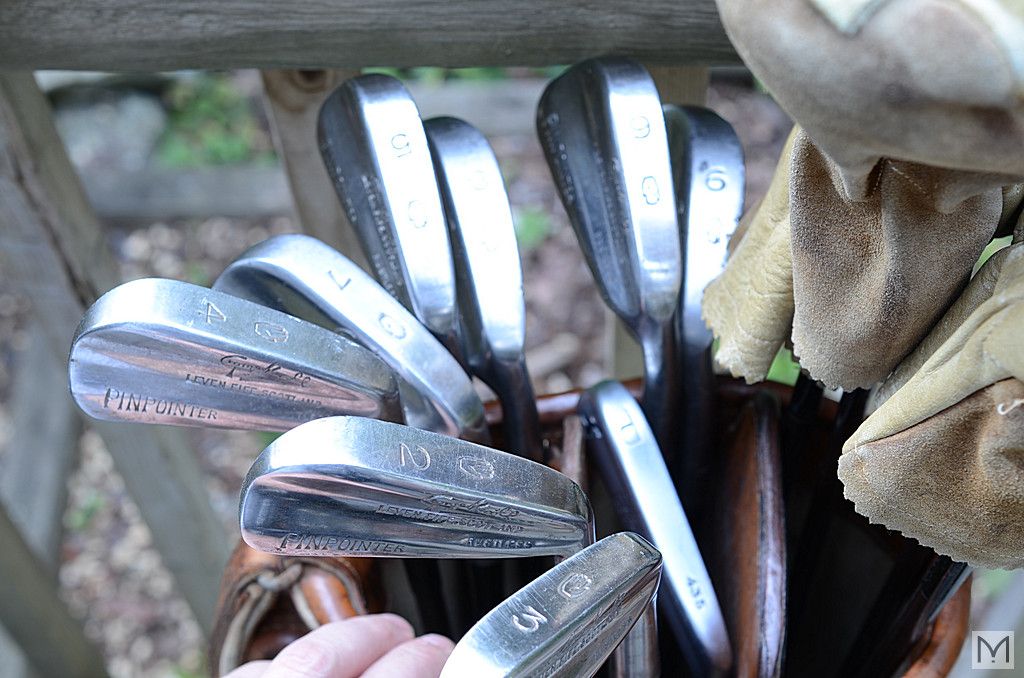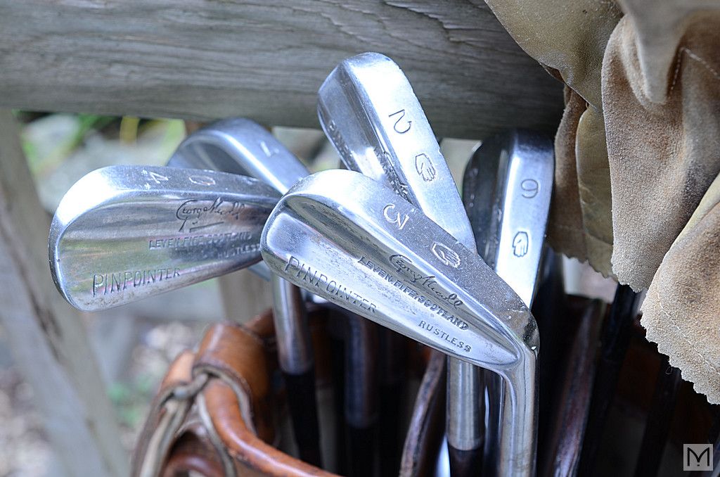 Circa 1935? Golf Club Set - PINPOINTER Series - Made by George Nicoll, Scotland. Includes vintage canvas and leather bag and (4) leather club covers.