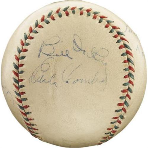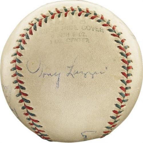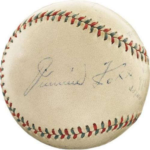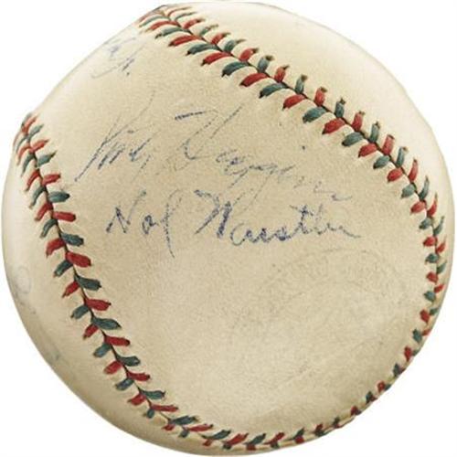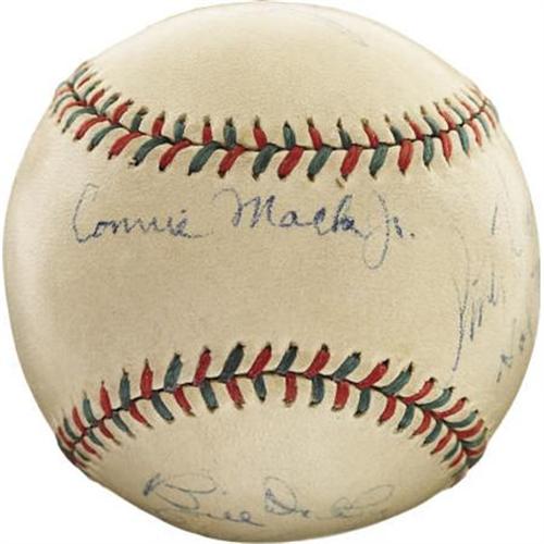 <B>Circa 1935 Hall of Famers Multi-Signed Baseball with Foxx, Lazzeri.</B></I> While we cannot date this "Official League Ball" with complete certainty, the cast of characters is likely explained by a mid-1930's meeting between the Philadelphia Athletics and the New York Yankees, as all resident autographs could be traced to those camps. Seven signatures are here in total: Foxx, Lazzeri, Combs, Dickey, Higgins, Warstler and Connie Mack, Jr. Both Foxx and Lazzeri display quite convincingly as singles, adding further appeal to a ball that has no shortage of such. Autograph strength varies from 6/10 to 8/10, clearly well inside the acceptable range for a septuagenarian sphere. <I>LOA from PSA/DNA. LOA from James Spence Authentication.</B></I><BR><BR><b>Shipping:</b> Balls, Pucks, etc., Small (<a target="_blank" href="http://www.heritageauctions.com/common/shipping.php">view shipping information</a>)