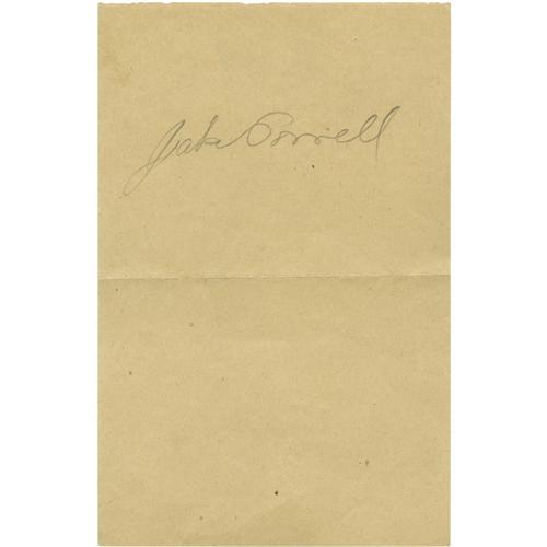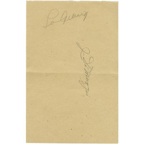 <B>Circa 1936 Lou Gehrig & Joe DiMaggio Signed Album Page.</B></I> Number Four and Number Five add up to a perfect ten here, as the Hall of Fame legends offer flawless pencil signature on a 4x6" sheet of paper. Gehrig appears in his late career style, while Joltin' Joe is in his highly desirable rookie-era format. A single vertical fold bisects DiMaggio's signature, but you need to really look closely to spot it. Otherwise the page is free of defects. Fellow Yank Jake Powell appears on verso, likewise in Mint pencil. <I>LOA from PSA/DNA. LOA from James Spence Authentication.</B></I><BR><BR><b>Shipping:</b> Flat Material, Small (<a target="_blank" href="http://www.heritageauctions.com/common/shipping.php">view shipping information</a>)