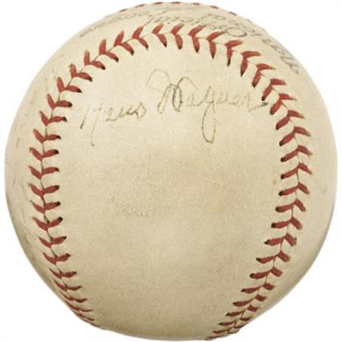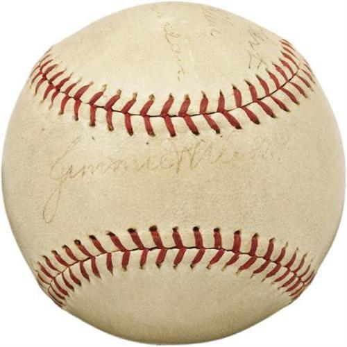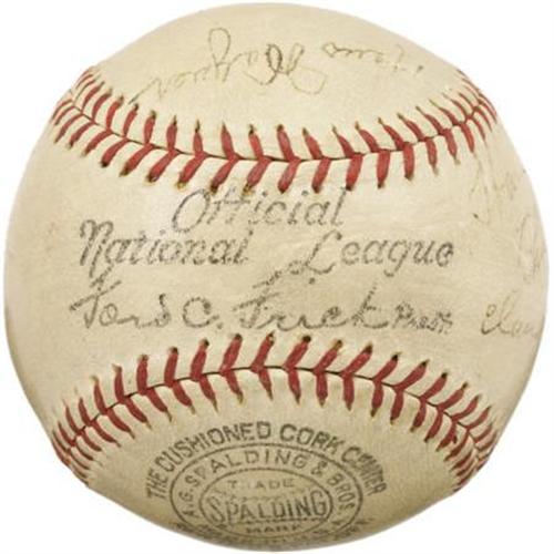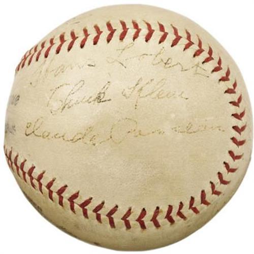 <B>Circa 1938 Chuck Klein & Honus Wagner Signed Baseball.</B></I> Five autographs upon this ONL (Frick) ball were apparently garnered at a meeting between the two National League representatives of the state of Pennsylvania. From this small cast of Pirates and Phillies, two tough Hall of Famers catch the eye, namely superstar outfielder Chuck Klein and the Dead Ball era's greatest shortstop Honus Wagner. Phillies managers Hans Lobert and Jimmie Wilson are here as well, along with pitcher Claude Passeau. Signature quality ranges from 4/10 to 6/10, and the ball is lightly and evenly toned. <I>LOA from PSA/DNA. LOA from James Spence Authentication.</B></I><BR><BR><b>Shipping:</b> Balls, Pucks, etc., Small (<a target="_blank" href="http://www.heritageauctions.com/common/shipping.php">view shipping information</a>)