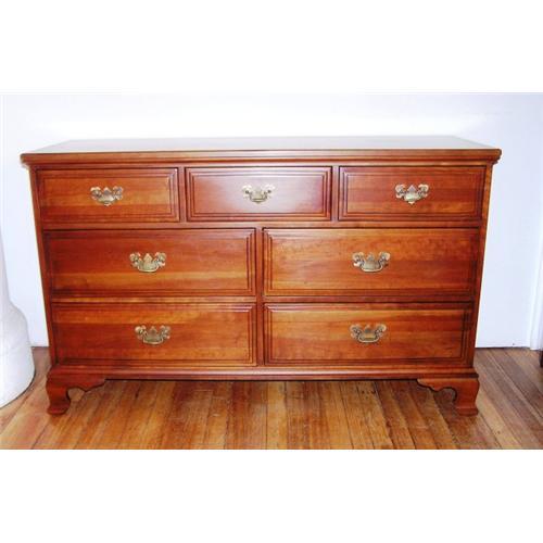 This gorgeous double dresser in a chippendale style is made of solid cherry by craftsman Davis Furniture Co., from Nashville Tenn. circa 1940. The condition is immaculate, looks brand new. Also available is a matching hanging mirror, nightstand and bed. The dimensions are: W-54 D-20 H-33.5