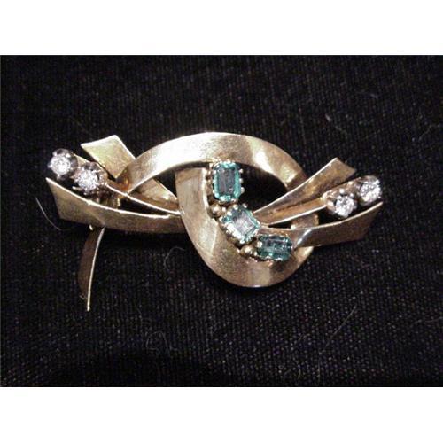 Fabulous Circa 1940 18kt yellow gold, emerald and diamond stylized ribbon brooch set with three emeralds approx 1.2 ct total weight and approx .35 ct of diamonds (4 diamonds) total weight. Wonderful style. Great stones. Attractive look.