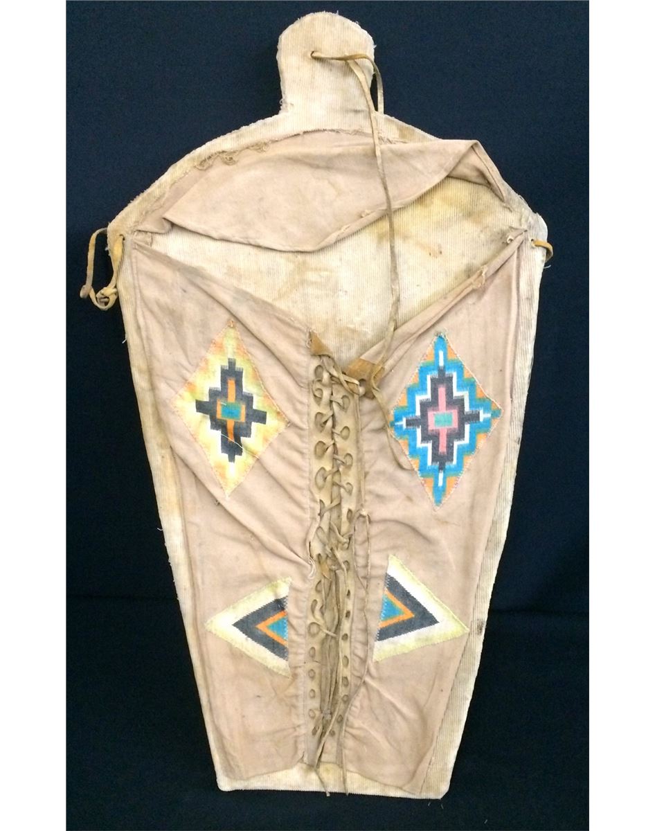 This cradleboard measures 25" long x 14" wide and shows some signs of use and fading. In decent condition for its age.