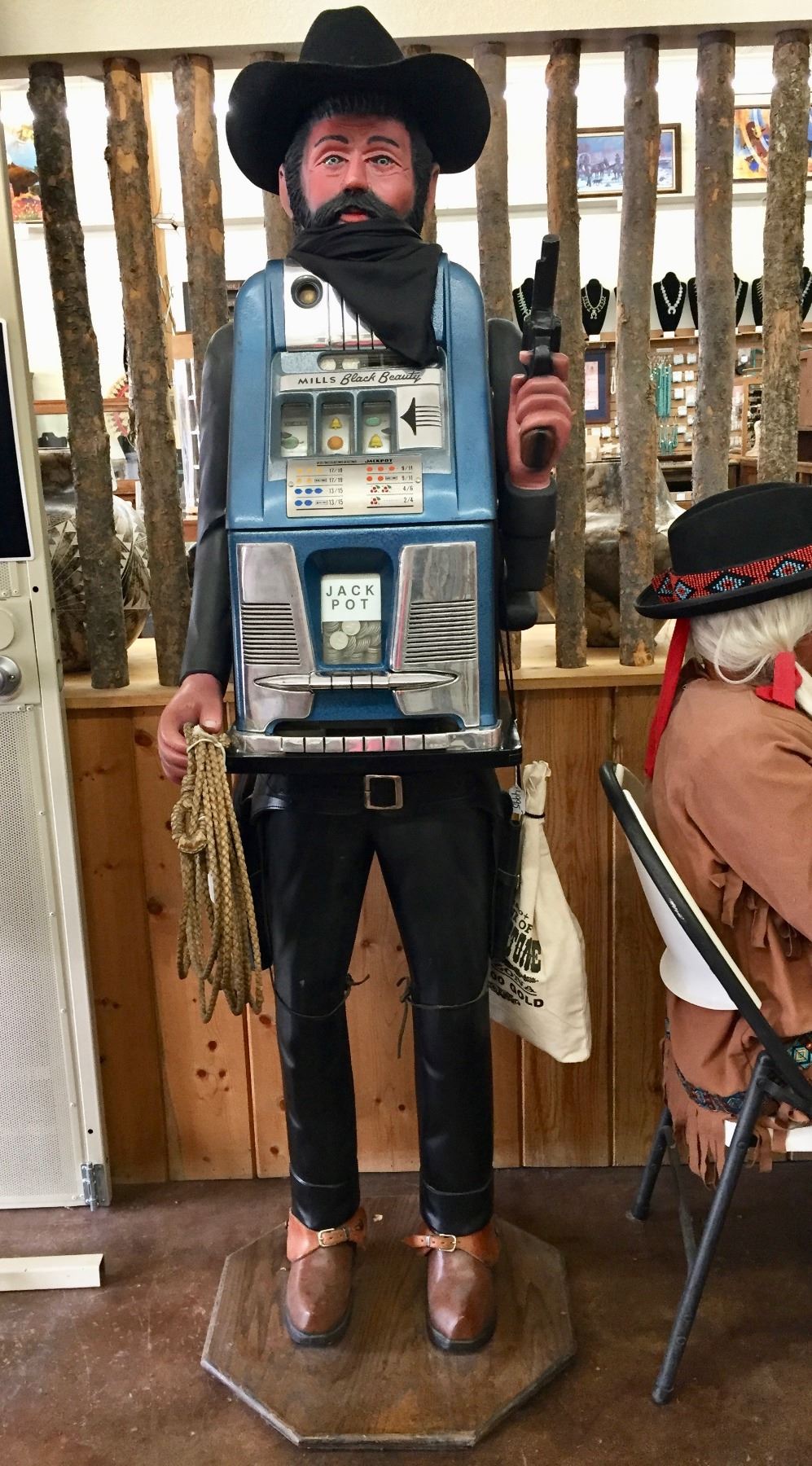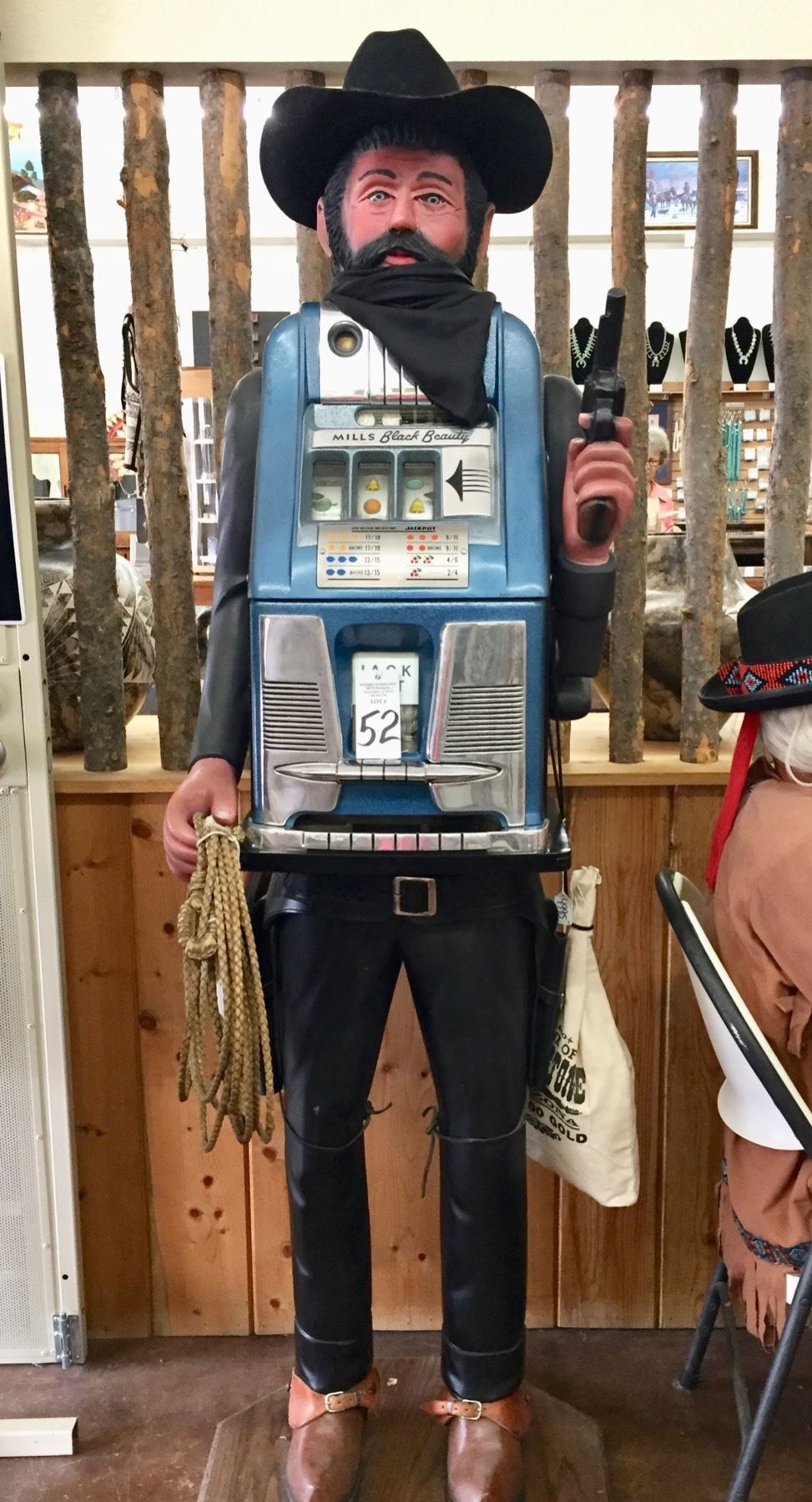 Description: For your consideration, an incredible hand-carved, life-sized “bandit,” 25 cent slot machine! With a hat, spurs, money bag, holster and gun for props! He stands on a wooden base. The slot machine is a vintage Mills. Maker: Mills on the slot machine. Carving is attributed to Richard DeLong. Approx. Age: Circa 1940s. Size: Stands about 6 feet tall is about 20” wide. Condition: Good for its age, normal wear expected. Please look closely at the pictures - they are an important part of our description. Shipping: There will be a $5 handling / packaging fee for shipping this lot. The actual cost of postage will be added on top of that.