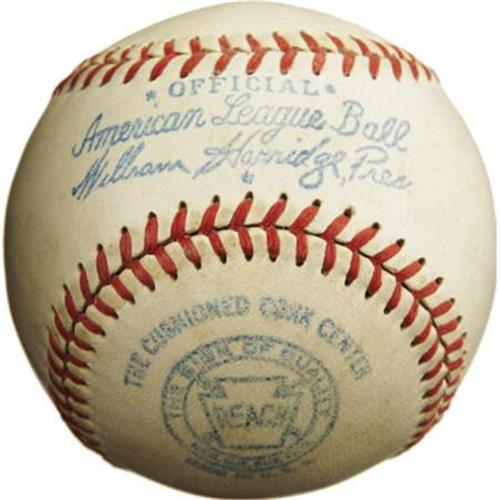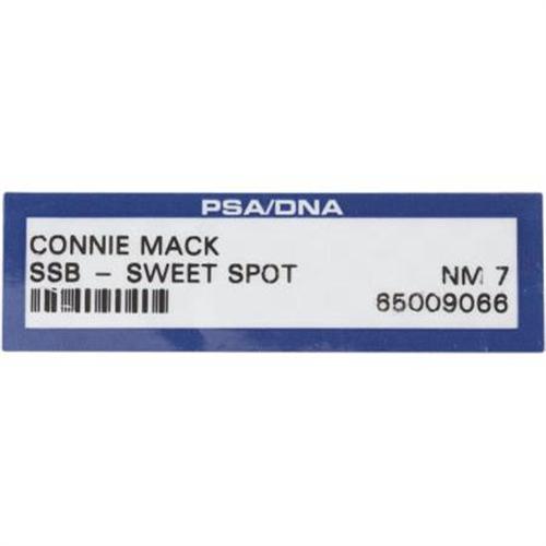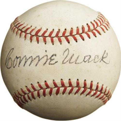 <B>Circa 1950 Connie Mack Single Signed Baseball, PSA NM 7.</B></I> The unique styling of this OAL (Harridge) sphere dates its birth to the final years of Mack's managerial reign or the earliest of his retirement. The sharp appearance of the ball matches the dapper wardrobe for which this long-serving legend was known, with a black fountain pen sweet spot signature rating an 8/10 on PSA/DNA's strict grading scale, and the ball netting a 6/10 for the composite score as listed. A top-tier specimen from the wise embodiment of baseball during the twentieth's century first half. <I>LOA from PSA/DNA. LOA from James Spence Authentication.</B></I><BR><BR><b>Shipping:</b> Balls, Pucks, etc., Small (<a target="_blank" href="http://www.heritageauctions.com/common/shipping.php">view shipping information</a>)