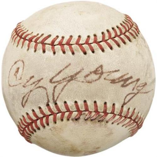 <B>Circa 1950 Cy Young Single Signed Baseball.</B></I> Perhaps the most famous Young single in the hobby, this exact sphere is pictured in the 1993 hardcover <I>Baseball Archaeology: Artifacts from the Great American Pastime.</B></I> One look and you can see how it was booked for the modeling gig, as the black ink sweet spot signature projects at a strength of 9/10. The ball exhibits a bit of staining, which helps to photo match this ball to the book, but nothing that adversely affects the autograph. The manufacturer's stamping has faded beyond visibility. Still a rock-solid example that will ably complete your collection of 500 Win Club singles. <I>LOA from PSA/DNA.</B></I><BR><BR><b>Shipping:</b> Balls, Pucks, etc., Small (<a target="_blank" href="http://www.heritageauctions.com/common/shipping.php">view shipping information</a>)