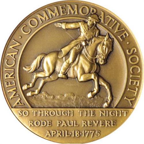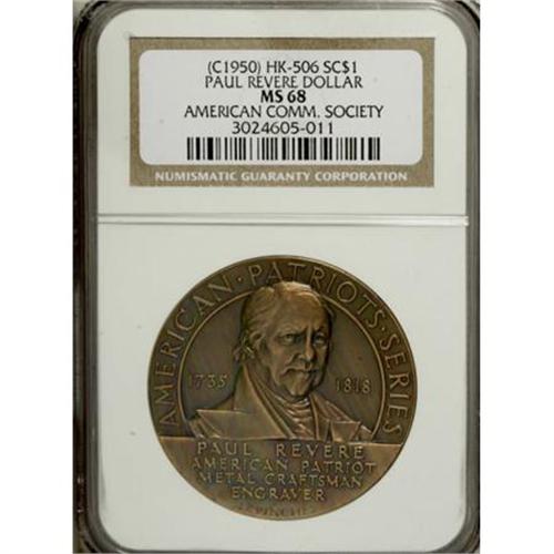 <B>Circa 1950 Paul Revere Dollar, HK-506, MS68 NGC.</B></I> Bronze, 38.1 mm. Although undated, this so-called dollar is believed to have been struck circa 1950. Medallic Art Company struck this J.R. Pinches-designed and -engraved medal, which likely commemorates the 175th anniversary of Paul Revere's famous ride. Hibler and Kappen, in their 1963 reference, suggest that "... not more than 200 to 250" pieces of this issue were struck. That alone makes this an elusive issue. Now consider that the current example is the finest thus certified by NGC, having been awarded the coveted MS68 designation; a lofty grade rarely bestowed upon any so-called dollar. The sultry-bronze coloration of this piece gracefully adorns mark-free surfaces which epitomize the meaning of the word "perfection." A stunning example of a scarce issue that would be the highlight of any cabinet. Census: 1 in 68, 0 finer (8/07).<BR><BR><b>Shipping:</b> Coins & Currency (<a target="_blank" href="http://www.heritageauctions.com/common/shipping.php">view shipping information</a>)
