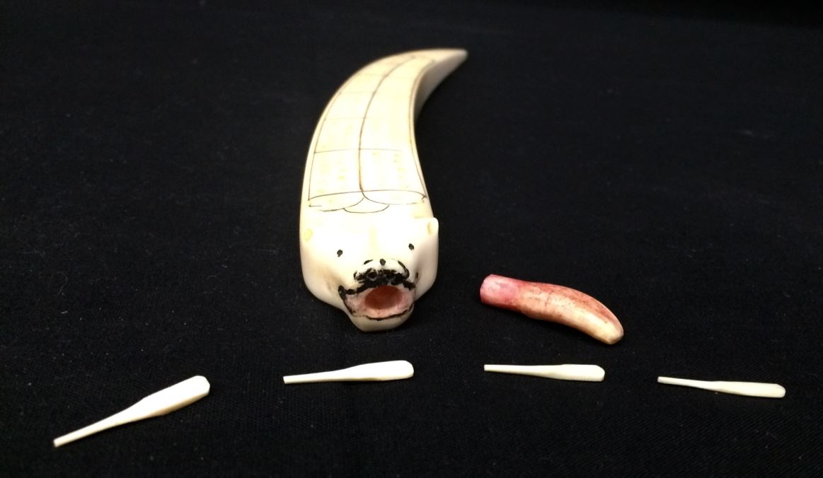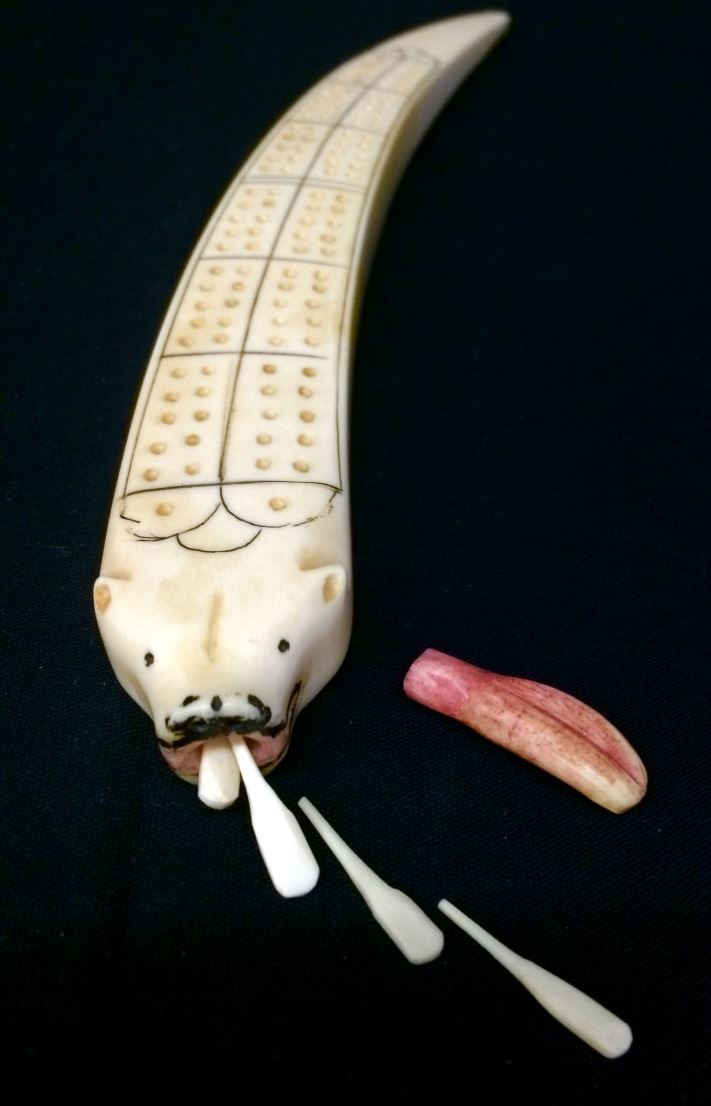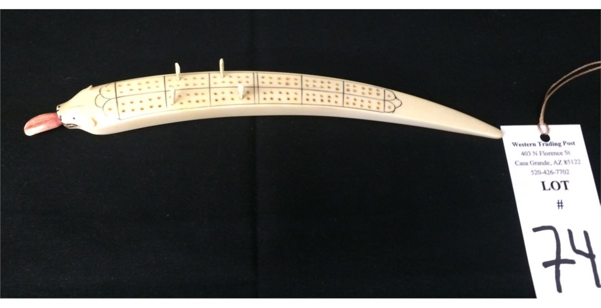 This cribbage board has a Polar Bear head carved into the end and it has a removable tongue where the 4 playing pieces are stored. Made from Walrus tusk with scrimshaw work. Originally purchased from an Alaskan Native circa the 1950s at St. Lawrence Island. Measures approx. 12” long. Good condition. Shipping: There will be a $7 handling / packaging fee for shipping this lot. The actual cost of postage will be added on top of that.