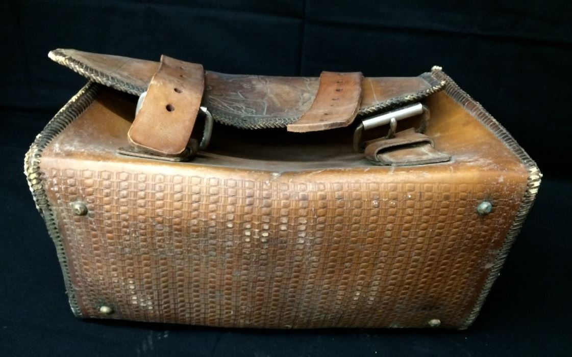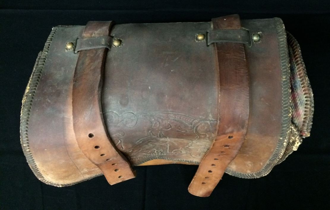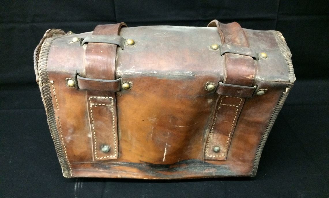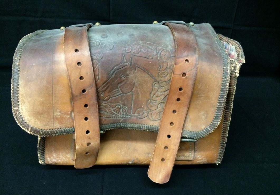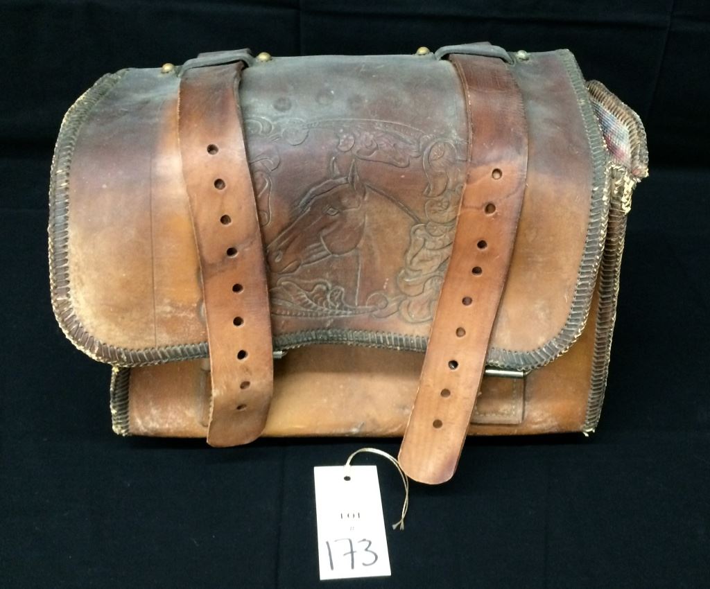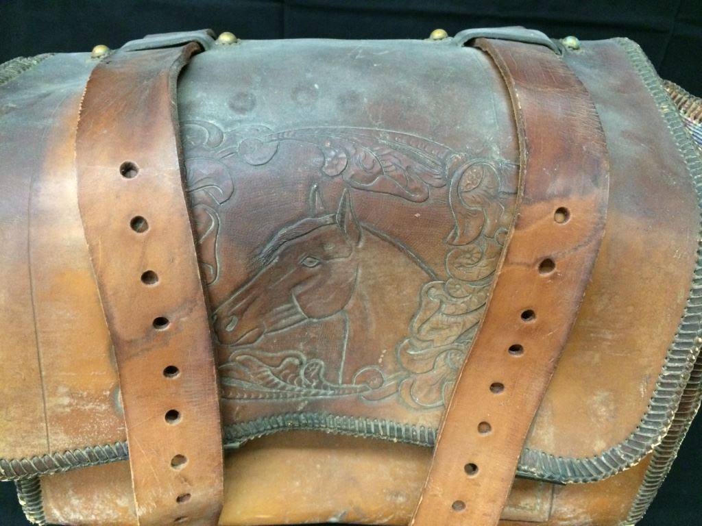 This old leather motorcycle saddlebag has a western theme and a horses head tooled on it. Measures 16” wide X 8” X 11” tall. Could be repurposed for a number of uses. Needs some restoration in order to use, please look at pics to see what you get. Shipping: There will be a $7 handling / packaging fee for shipping this lot. The actual cost of postage will be added on top of that.