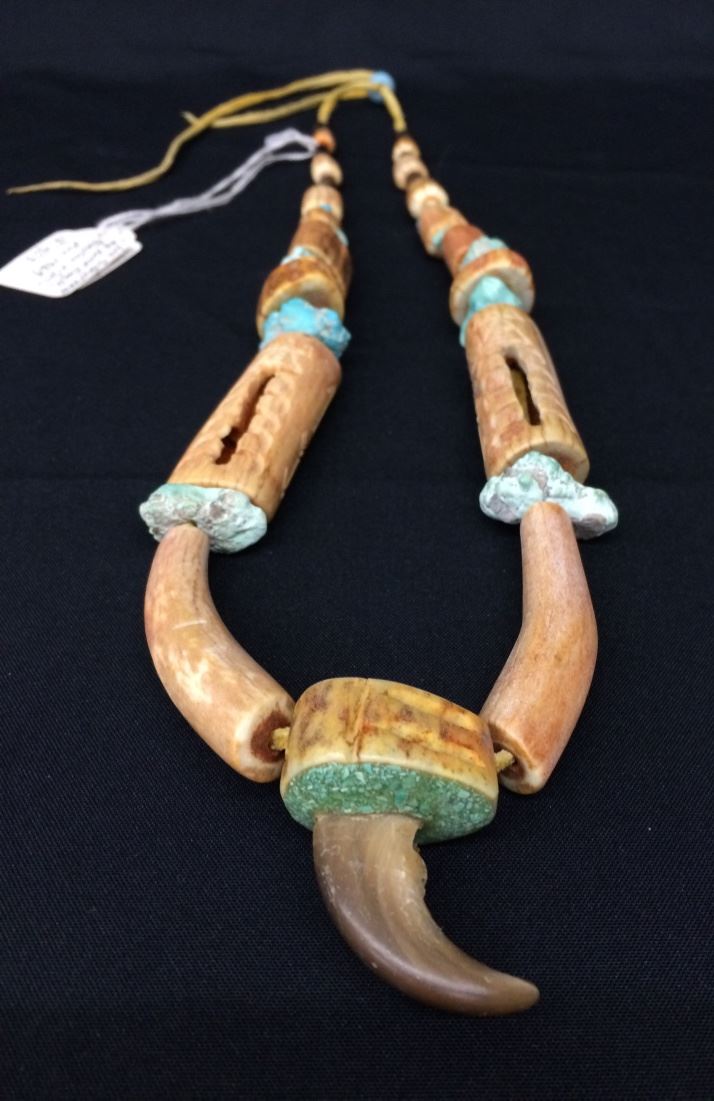This beautifully carved antler and turquoise necklace fits about 30” around the neck and is adjustable either way quite a bit. Strung on leather cord. Please look closely, the antlers are hand carved and the turquoise appears to be natural. There is a signature of L.E. inlayed with turquoise on the back of the pendant. There is an old tag with it attributing it to Lone Eagle of Clayton, NM - pre 1964. Good condition. Shipping: There will be a $5 handling / packaging fee for shipping this lot. The actual cost of postage will be added on top of that.