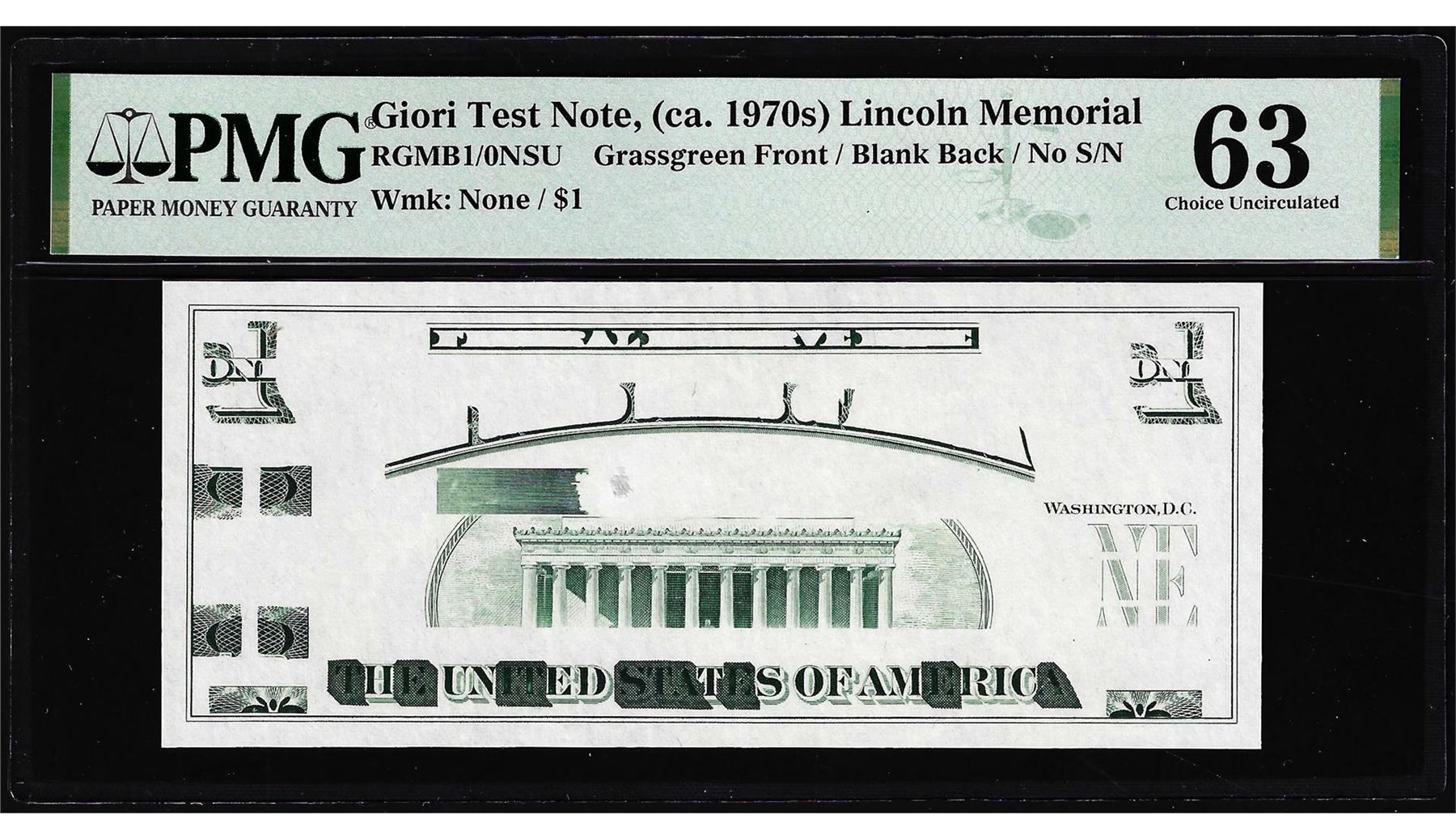 One Circa 1970's Lincoln Memorial Giori Test Note PMG Choice Uncirculated 63. PMG Certified.