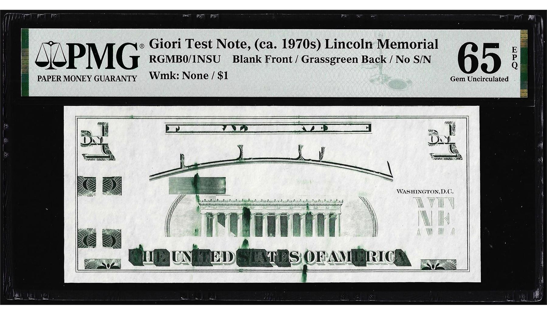 One Circa 1970's Lincoln Memorial Giori Test Note PMG Gem Uncirculated 65EPQ. PMG Certified.