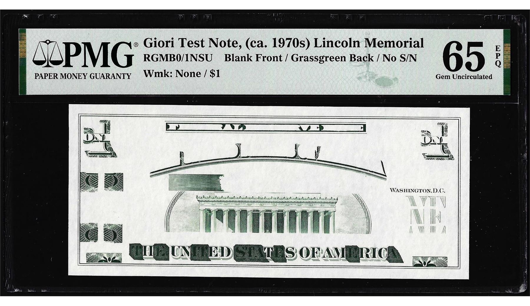 One Circa 1970's Lincoln Memorial Giori Test Note PMG Gem Uncirculated 65EPQ. PMG Certified.