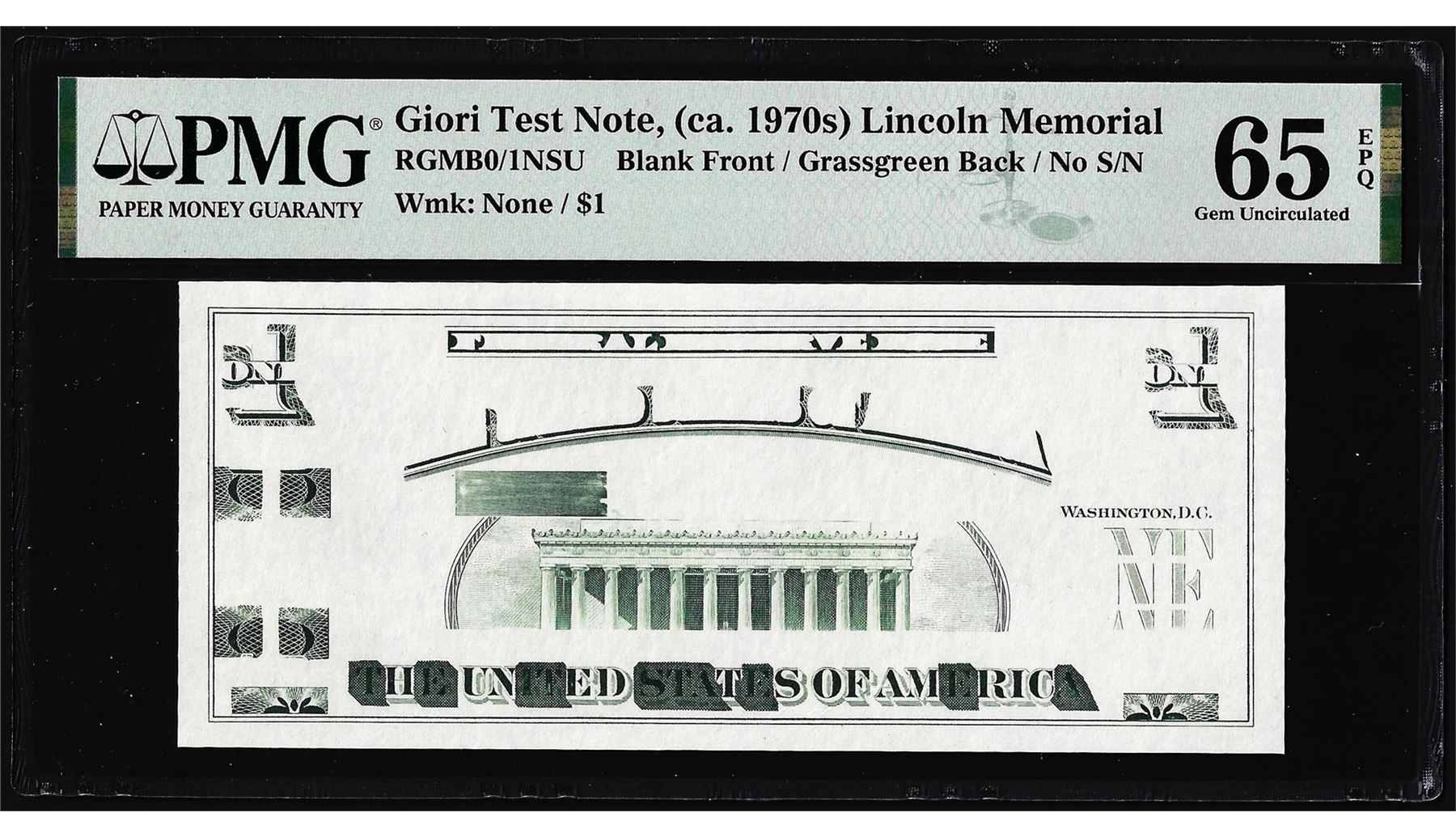 One Circa 1970's Lincoln Memorial Giori Test Note PMG Gem Uncirculated 65EPQ. PMG Certified.