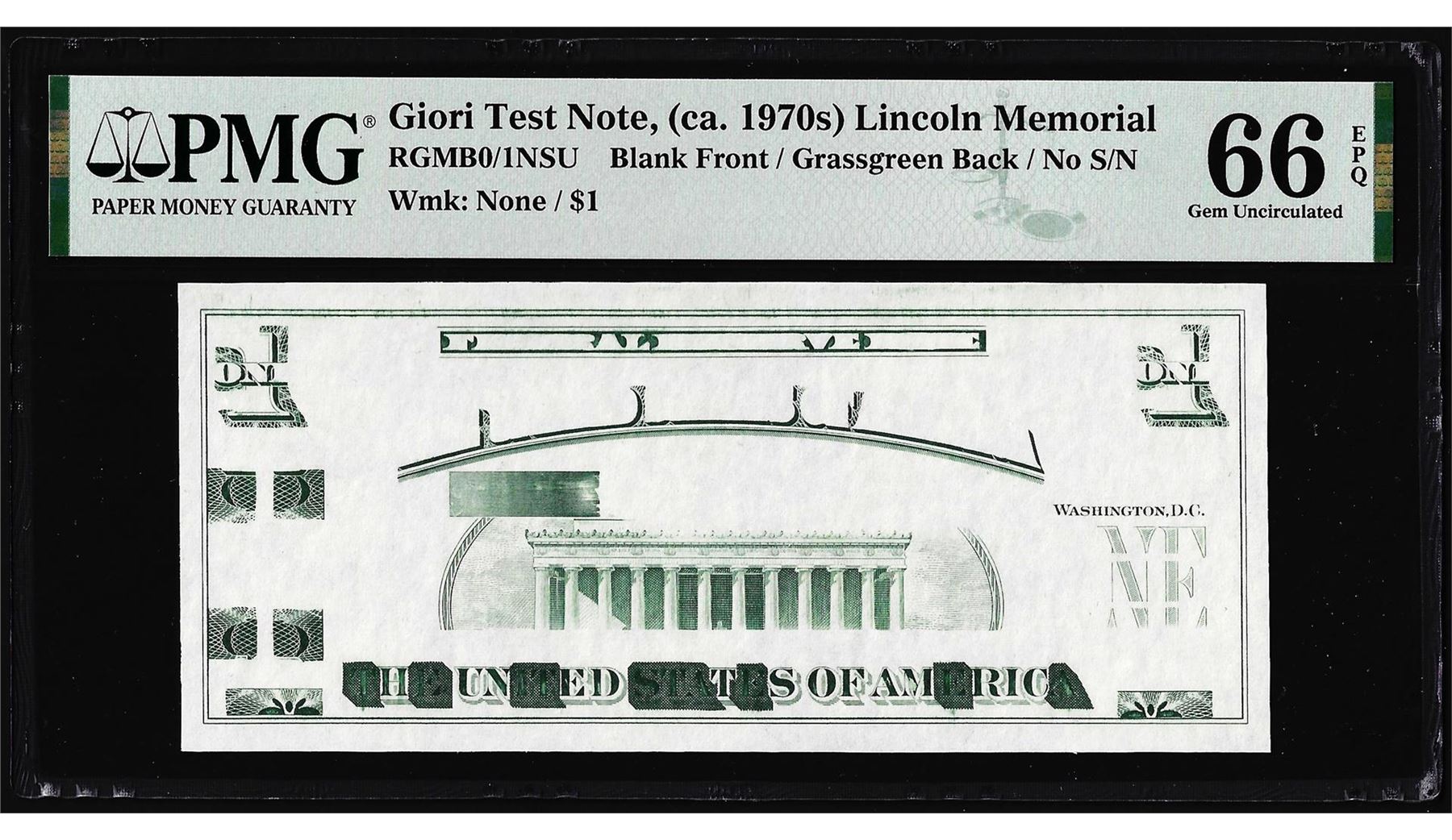 One Circa 1970's Lincoln Memorial Giori Test Note PMG Gem Uncirculated 66EPQ. PMG Certified.