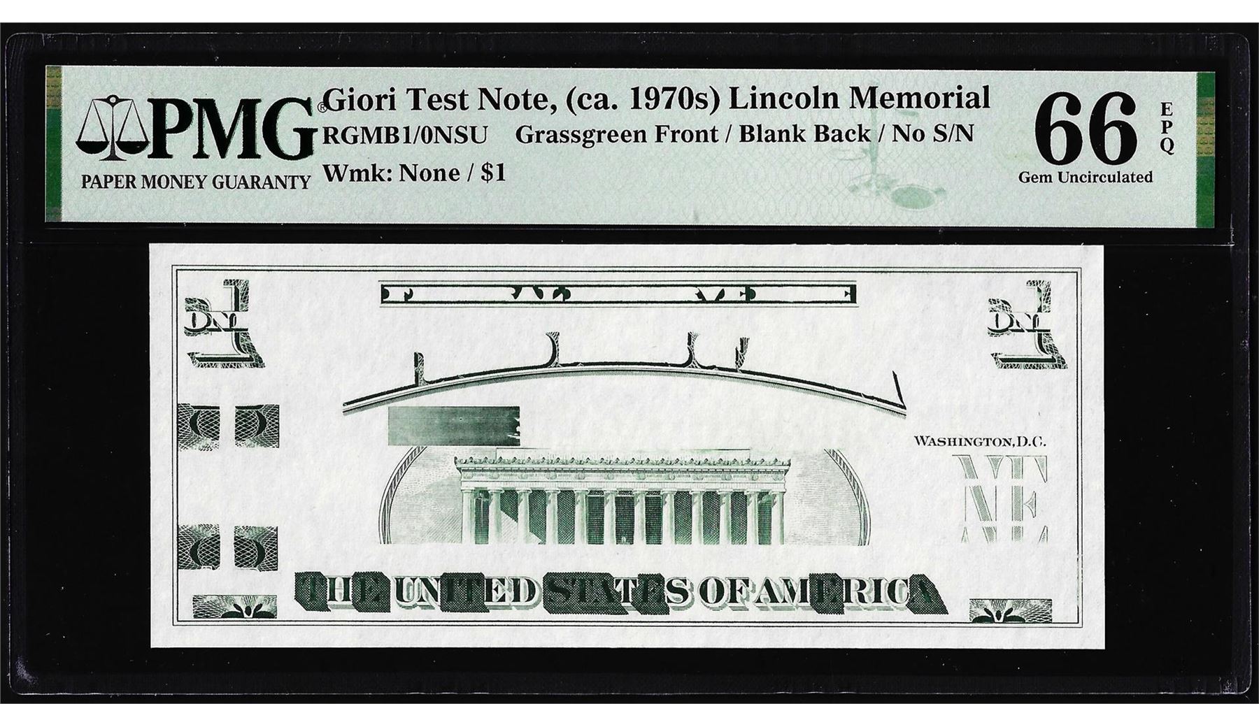 One Circa 1970's Lincoln Memorial Giori Test Note PMG Gem Uncirculated 66EPQ. PMG Certified.