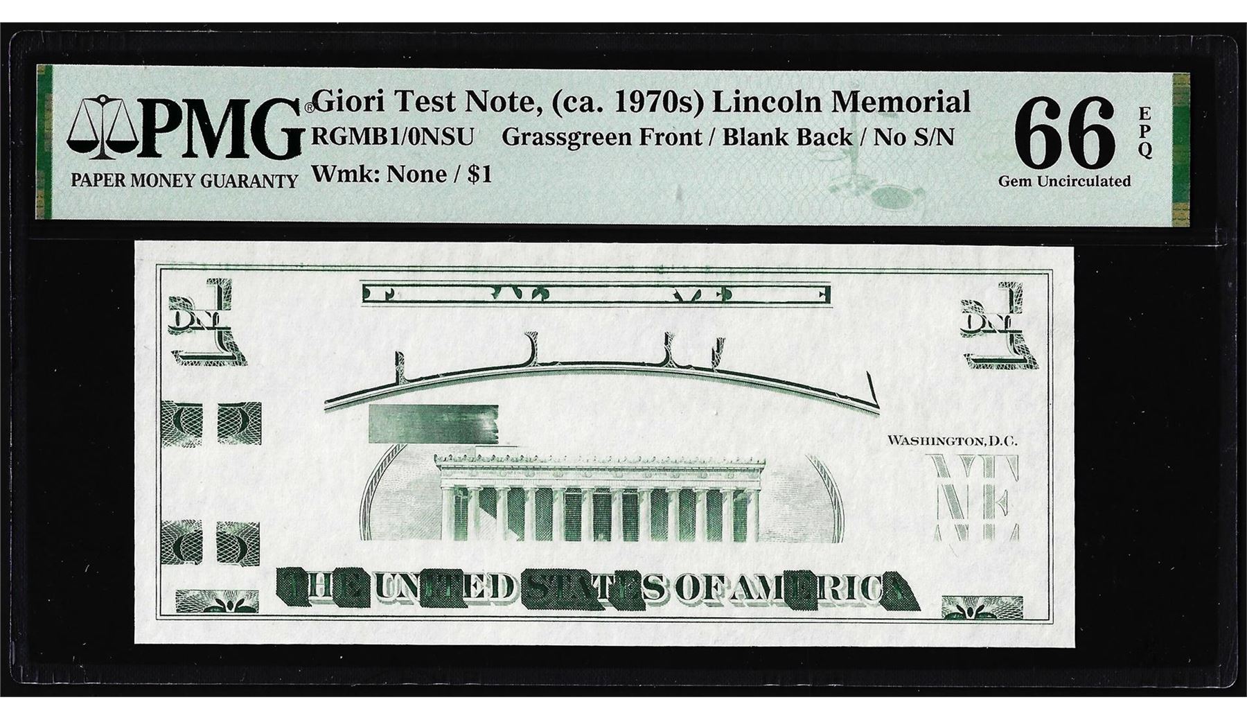 One Circa 1970's Lincoln Memorial Giori Test Note PMG Gem Uncirculated 66EPQ. PMG Certified.