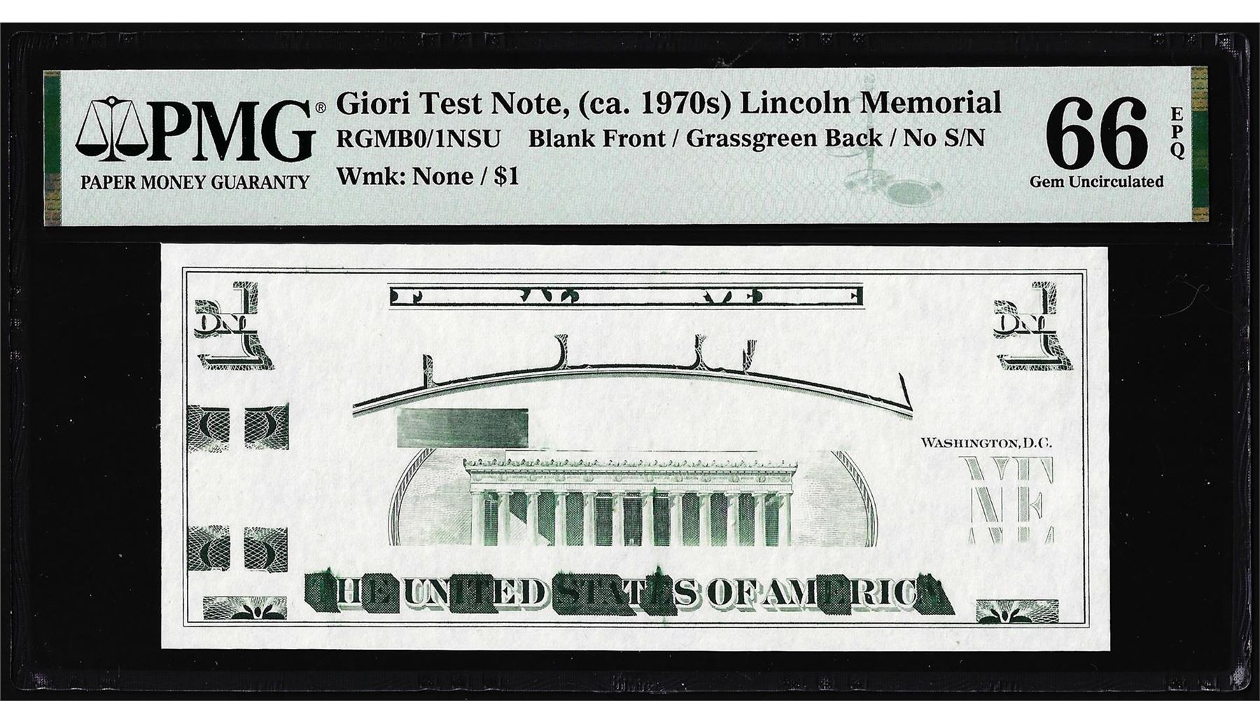 One Circa 1970's Lincoln Memorial Giori Test Note PMG Gem Uncirculated 66EPQ. PMG Certified.