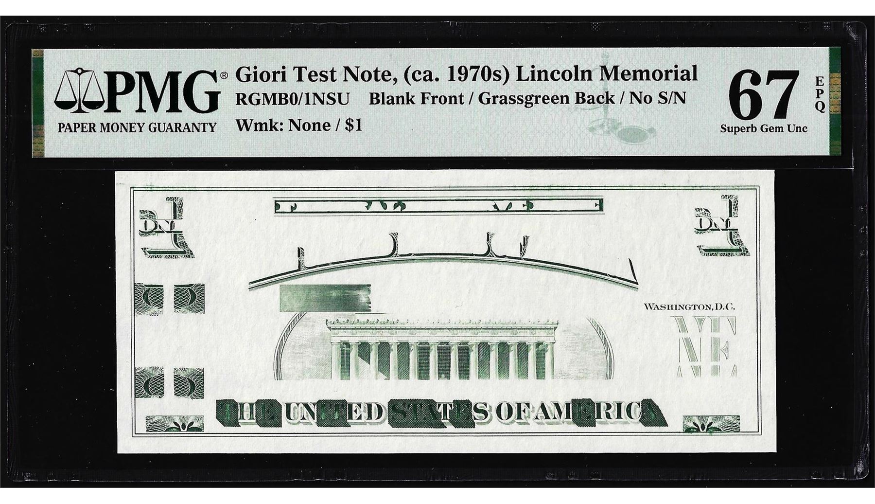One Circa 1970's Lincoln Memorial Giori Test Note PMG Superb Gem Uncirculated 67EPQ. PMG Certified.