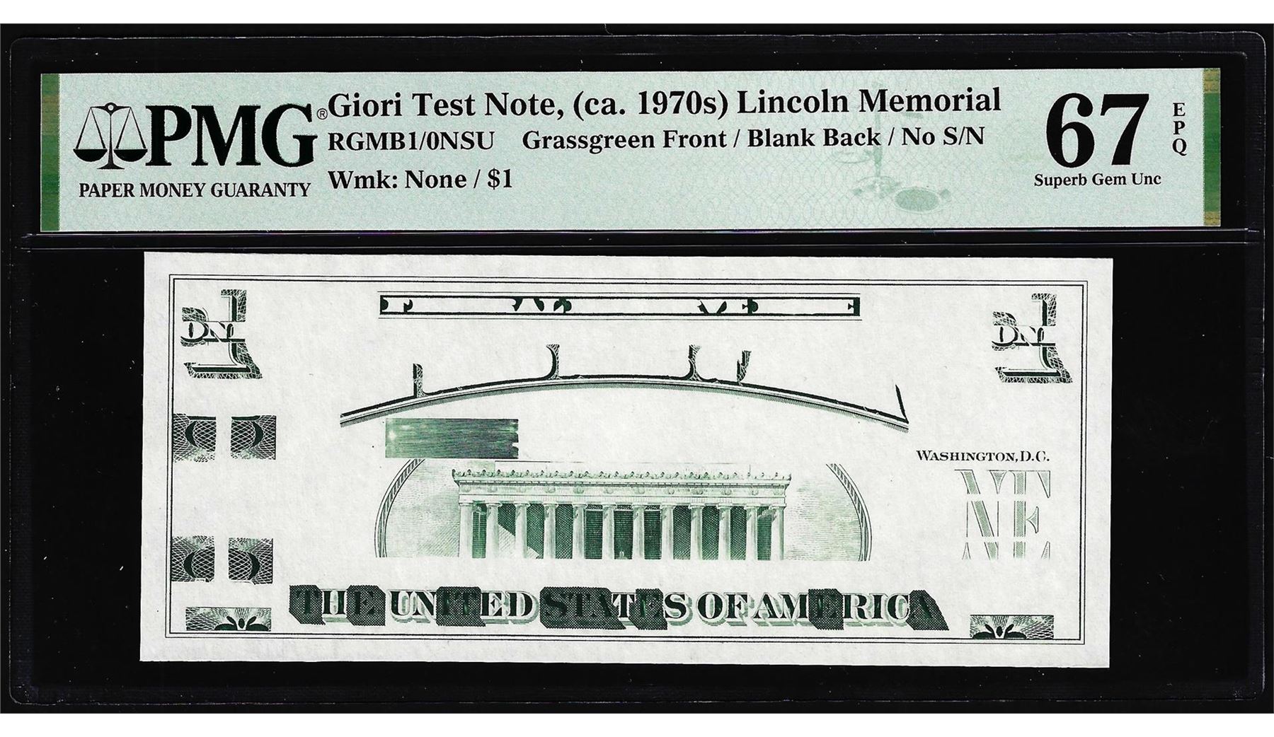 One Circa 1970's Lincoln Memorial Giori Test Note PMG Superb Gem Uncirculated 67EPQ. PMG Certified.