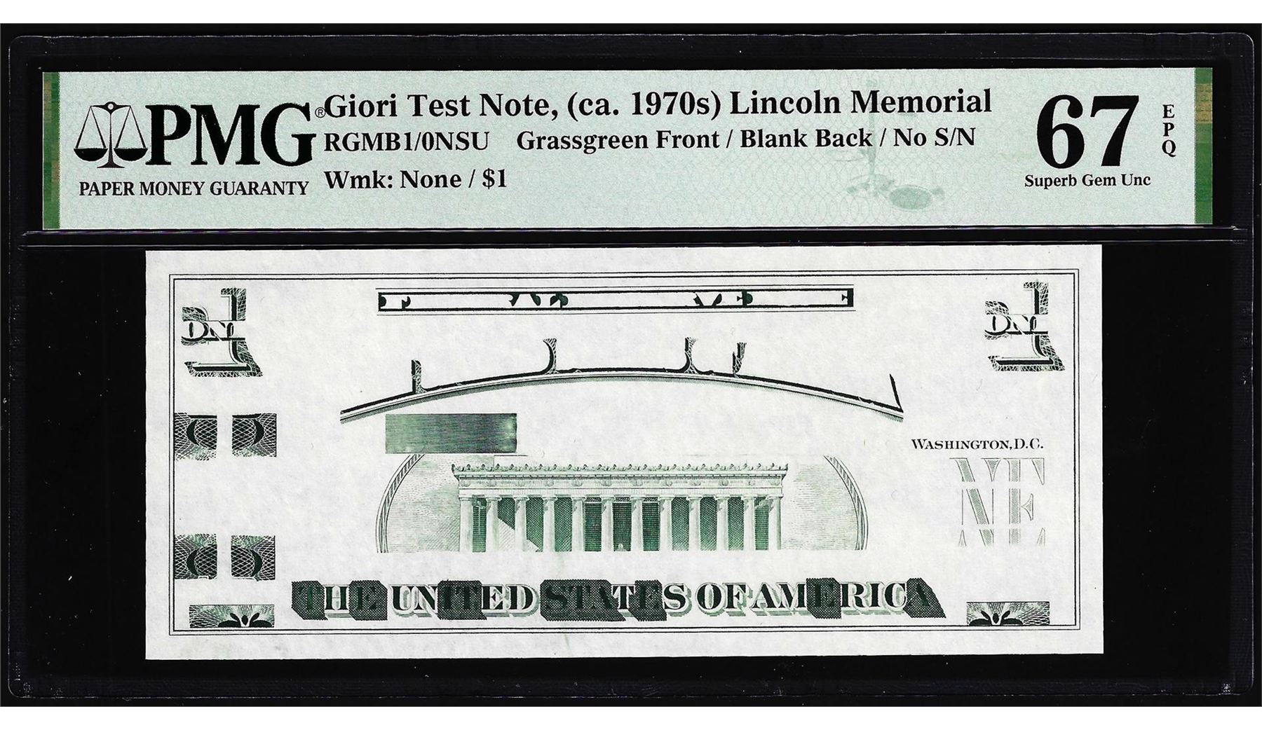 One Circa 1970's Lincoln Memorial Giori Test Note PMG Superb Gem Uncirculated 67EPQ. PMG Certified.