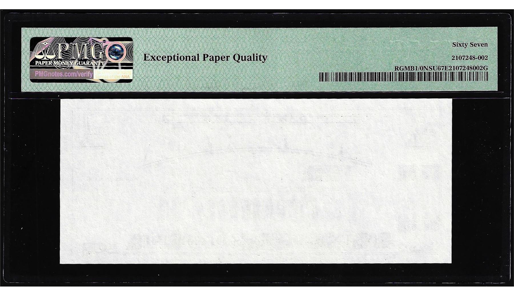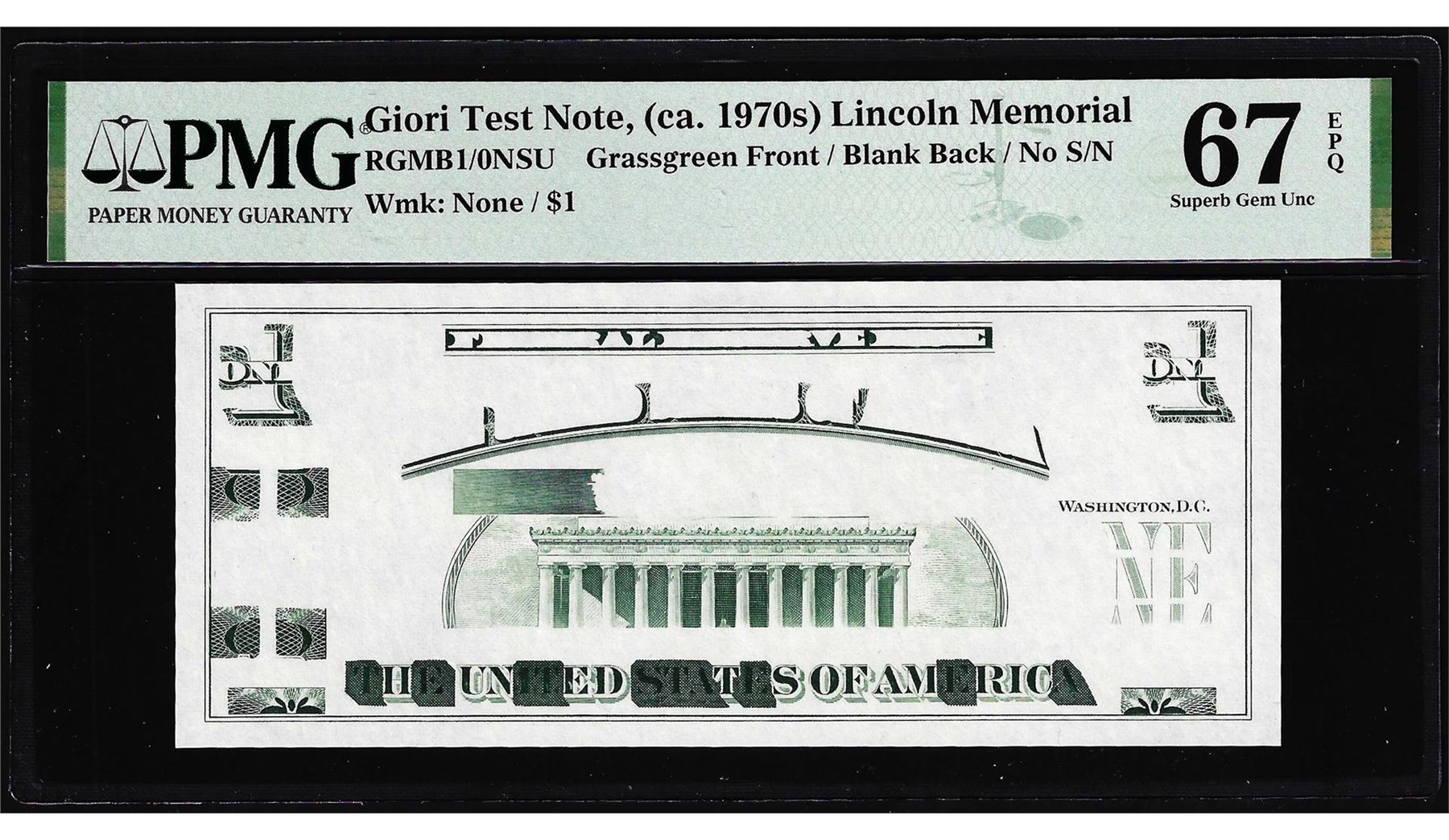 One Circa 1970's Lincoln Memorial Giori Test Note PMG Superb Gem Uncirculated 67EPQ. PMG Certified.