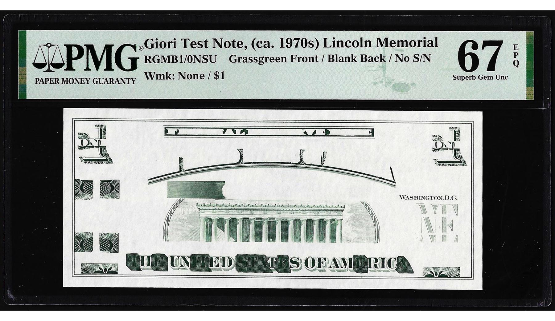 One Circa 1970's Lincoln Memorial Giori Test Note PMG Superb Gem Uncirculated 67EPQ. PMG Certified.