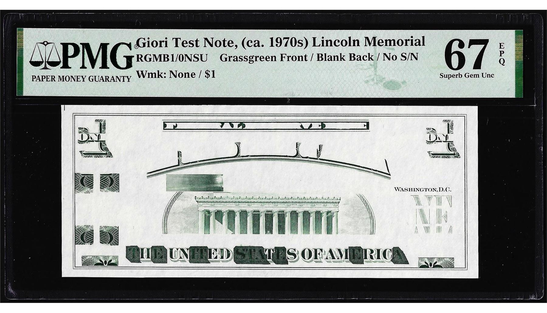 One Circa 1970's Lincoln Memorial Giori Test Note PMG Superb Gem Uncirculated 67EPQ. PMG Certified.