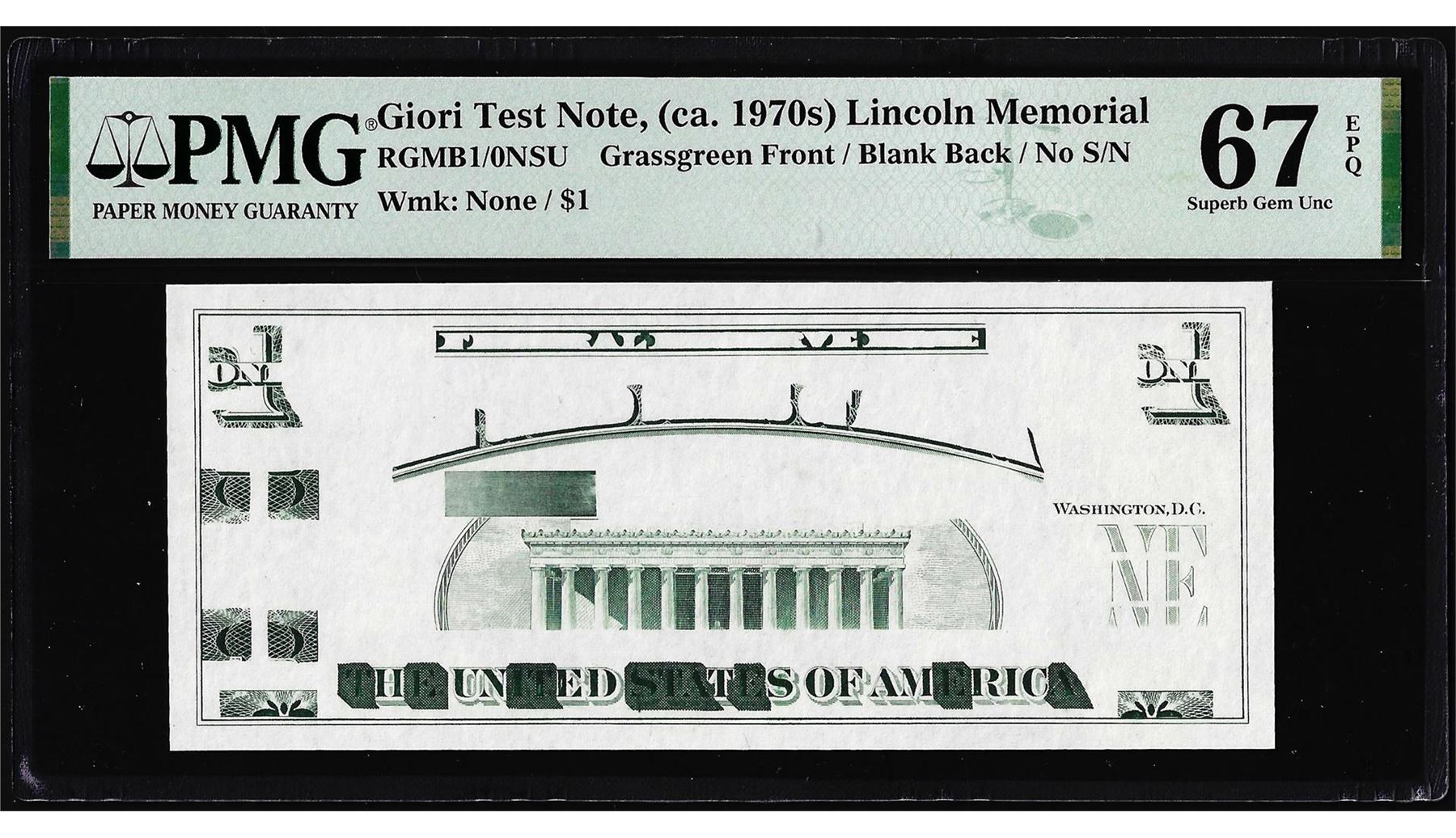One Circa 1970's Lincoln Memorial Giori Test Note PMG Superb Gem Uncirculated 67EPQ. PMG Certified.