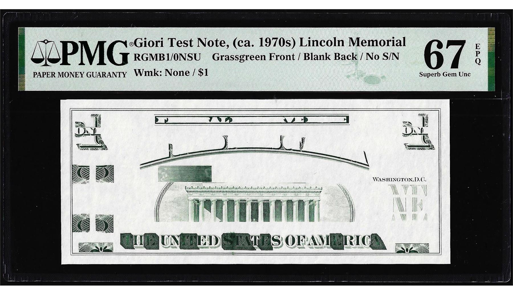 One Circa 1970's Lincoln Memorial Giori Test Note PMG Superb Gem Uncirculated 67EPQ. PMG Certified.