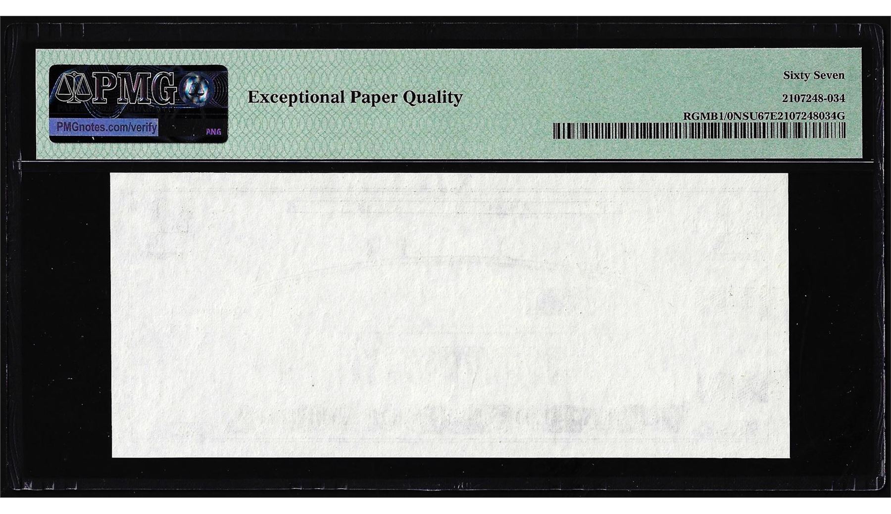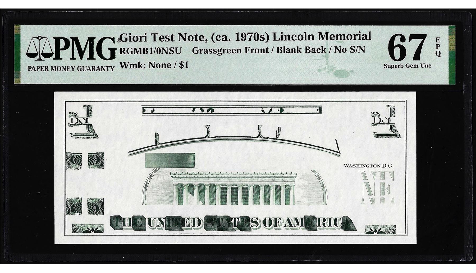 One Circa 1970's Lincoln Memorial Giori Test Note PMG Superb Gem Uncirculated 67EPQ. PMG Certified.