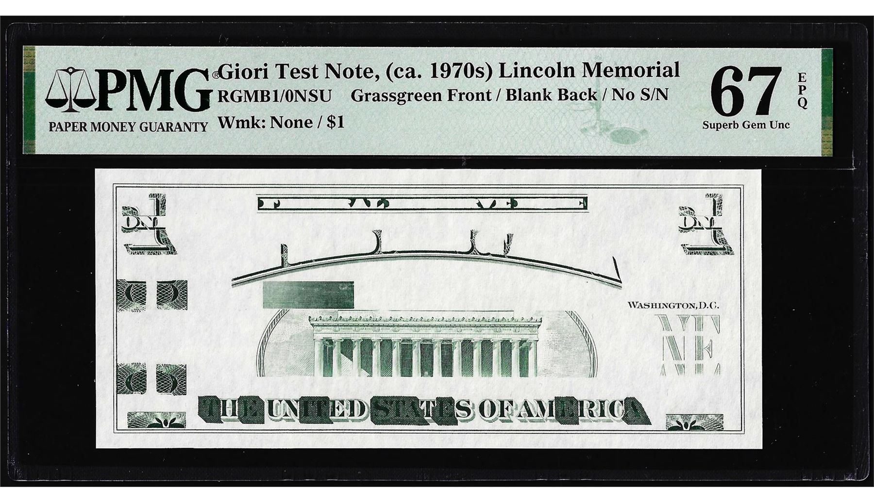 One Circa 1970's Lincoln Memorial Giori Test Note PMG Superb Gem Uncirculated 67EPQ. PMG Certified.
