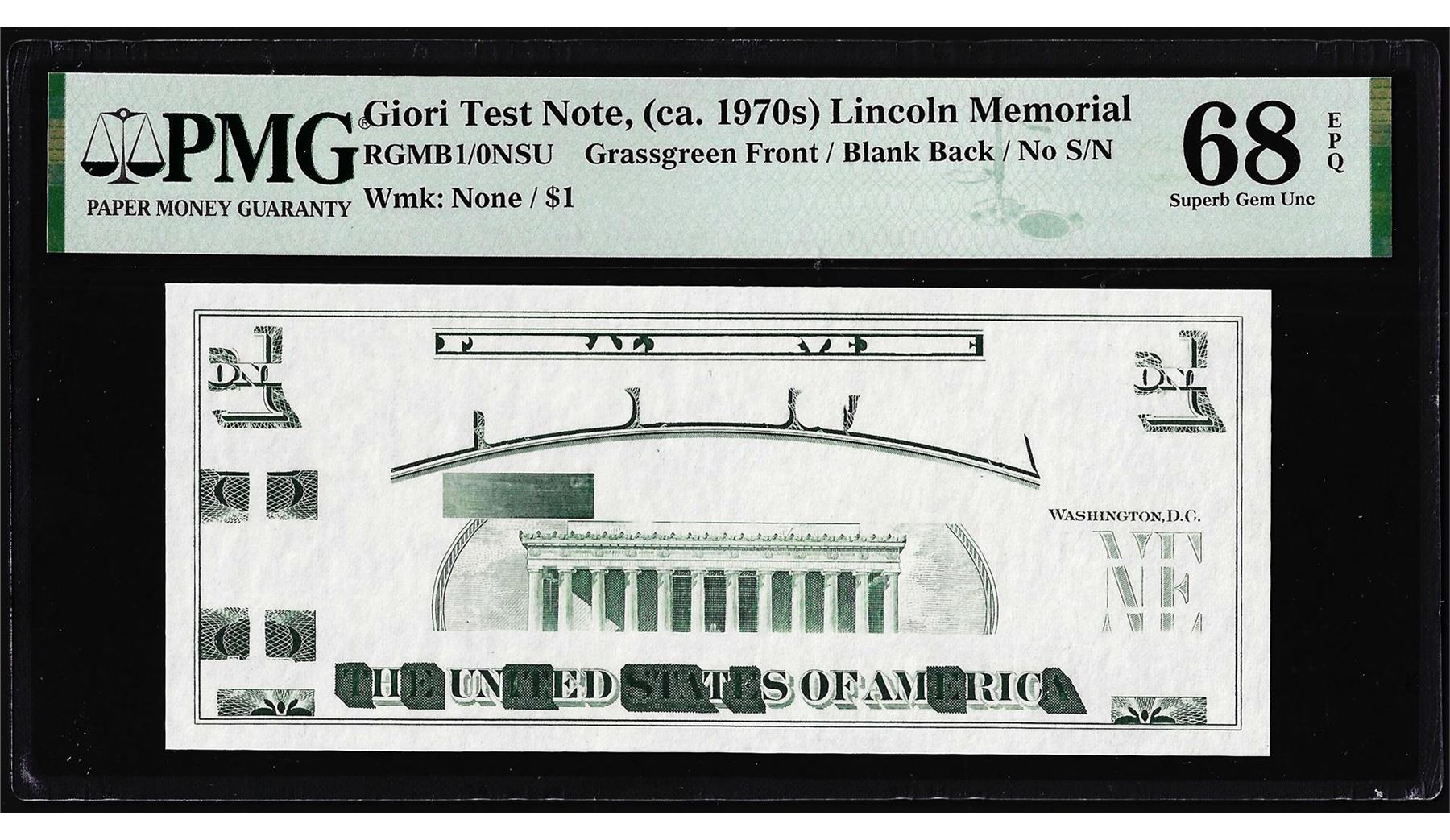 One Circa 1970's Lincoln Memorial Giori Test Note PMG Superb Gem Uncirculated 68EPQ. PMG Certified.