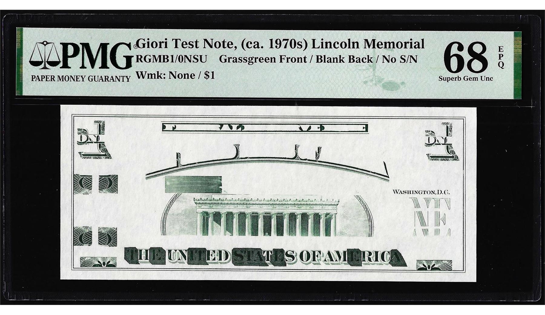 Circa 1970's Lincoln Memorial Giori Test Note PMG Superb Gem Uncirculated 68EPQ