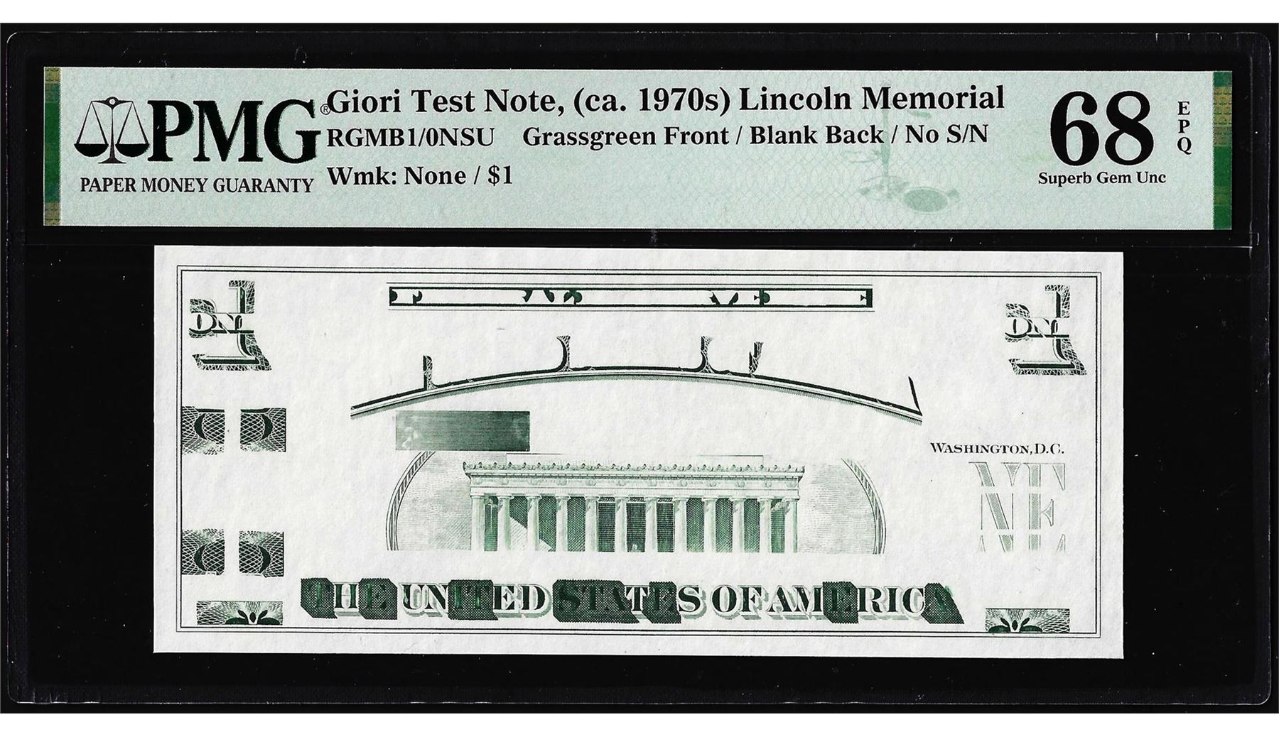 One Circa 1970's Lincoln Memorial Giori Test Note PMG Superb Gem Uncirculated 68EPQ. PMG Certified.