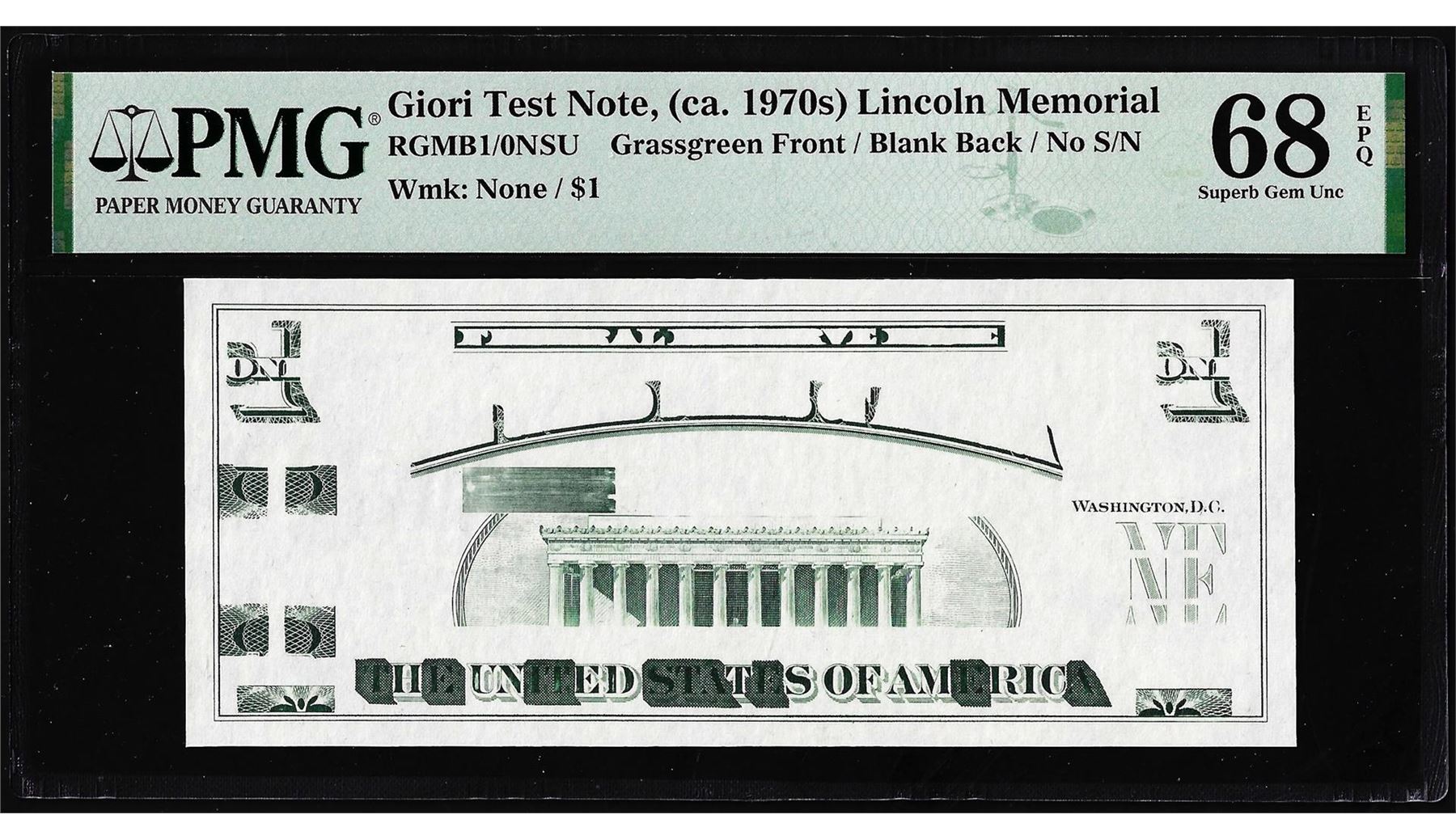 One Circa 1970's Lincoln Memorial Giori Test Note PMG Superb Gem Uncirculated 68EPQ. PMG Certified.