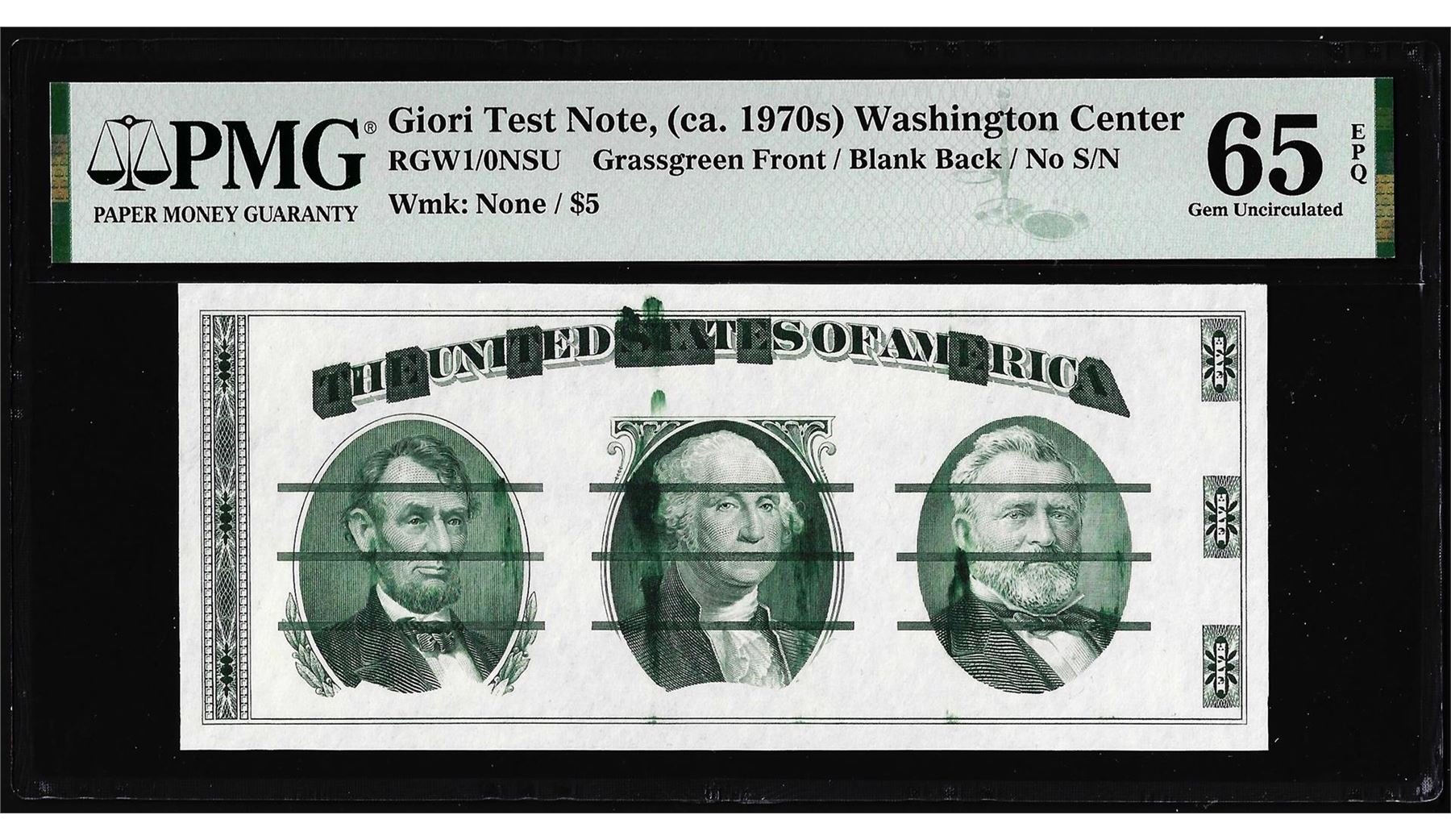 One Circa 1970's Washington Center Giori Test Note PMG Gem Uncirculated 65EPQ. PMG Certified.