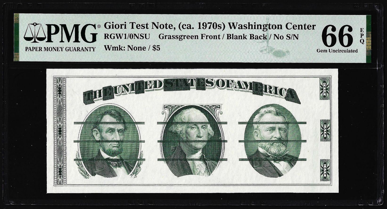 One Circa 1970's Washington Center Giori Test Note PMG Gem Uncirculated 66EPQ.