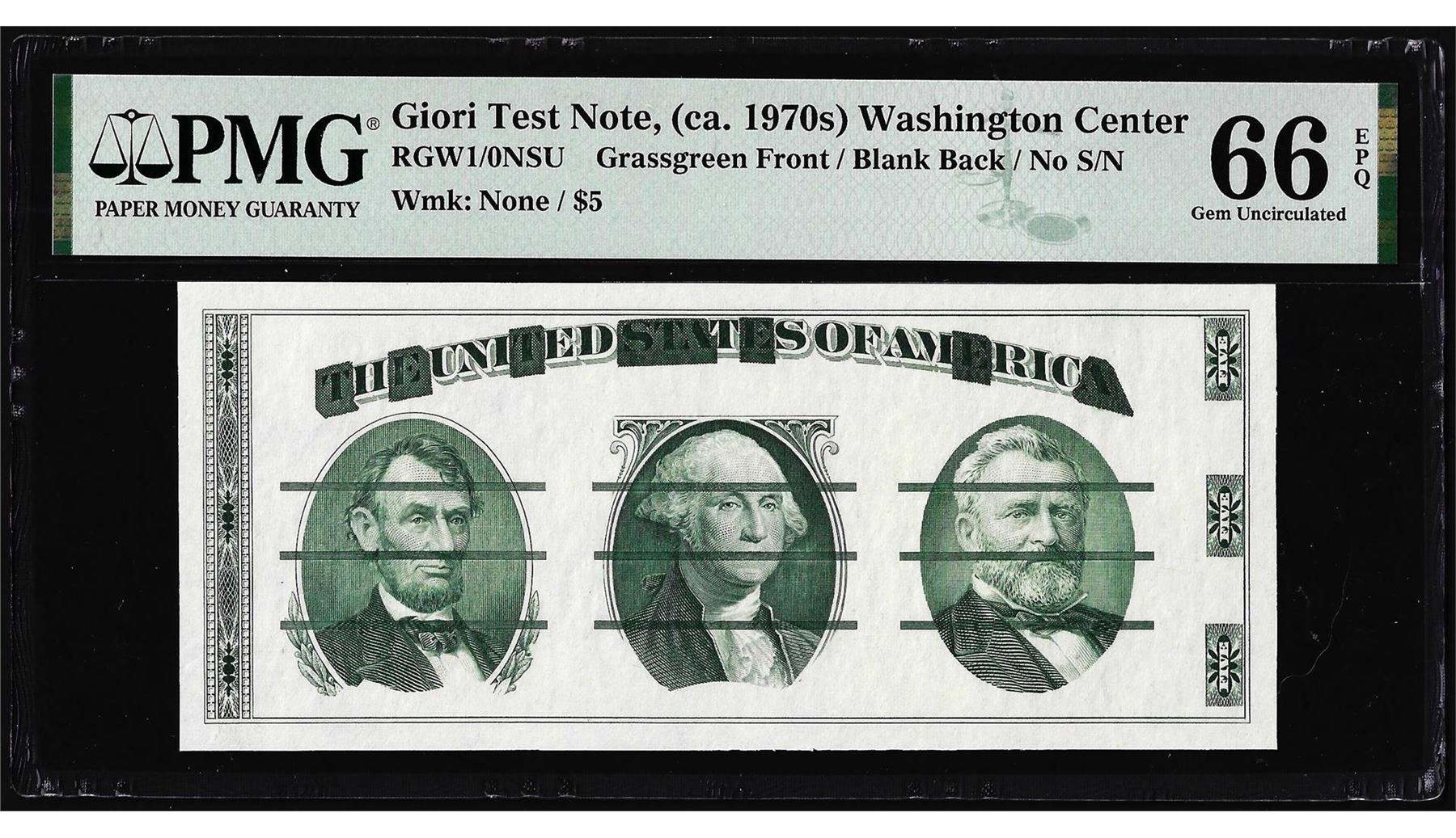 One Circa 1970's Washington Center Giori Test Note PMG Gem Uncirculated 66EPQ. PMG Certified.