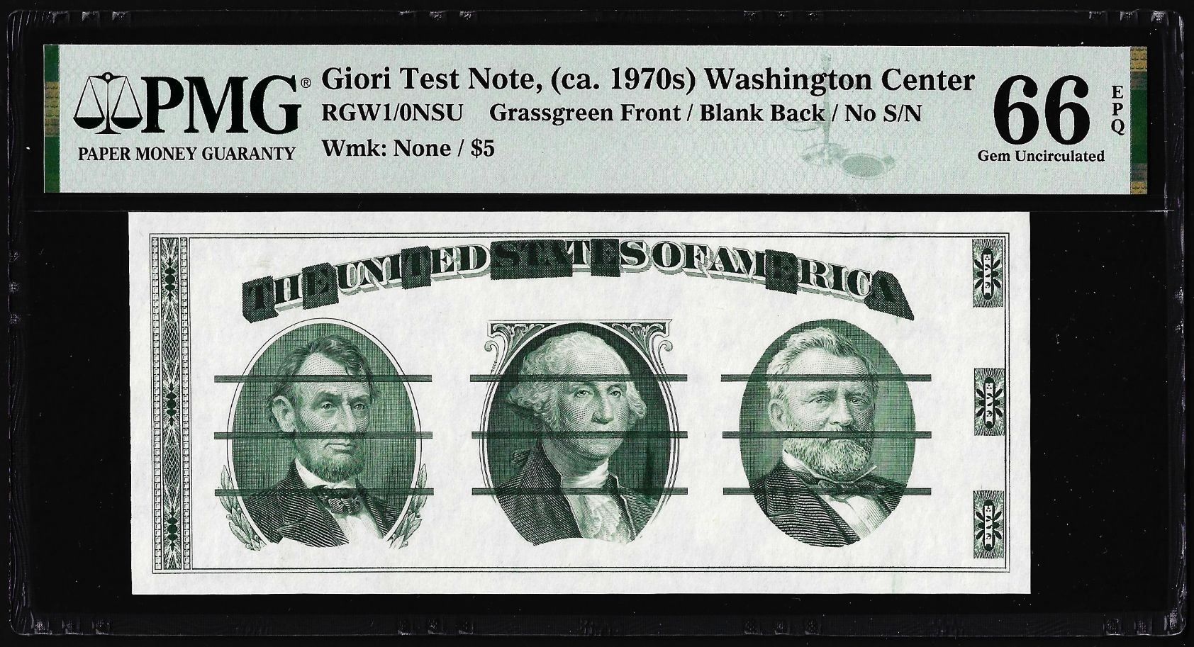 One Circa 1970's Washington Center Giori Test Note PMG Gem Uncirculated 66EPQ.