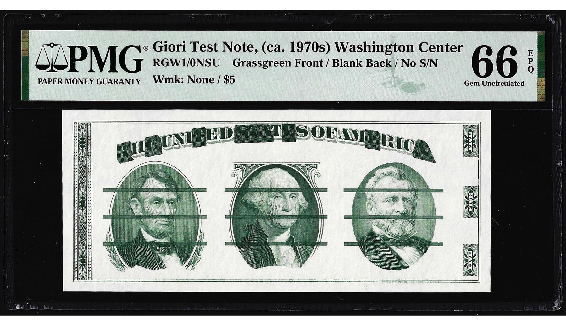 One Circa 1970's Washington Center Giori Test Note PMG Gem Uncirculated 66EPQ. PMG Certified.
