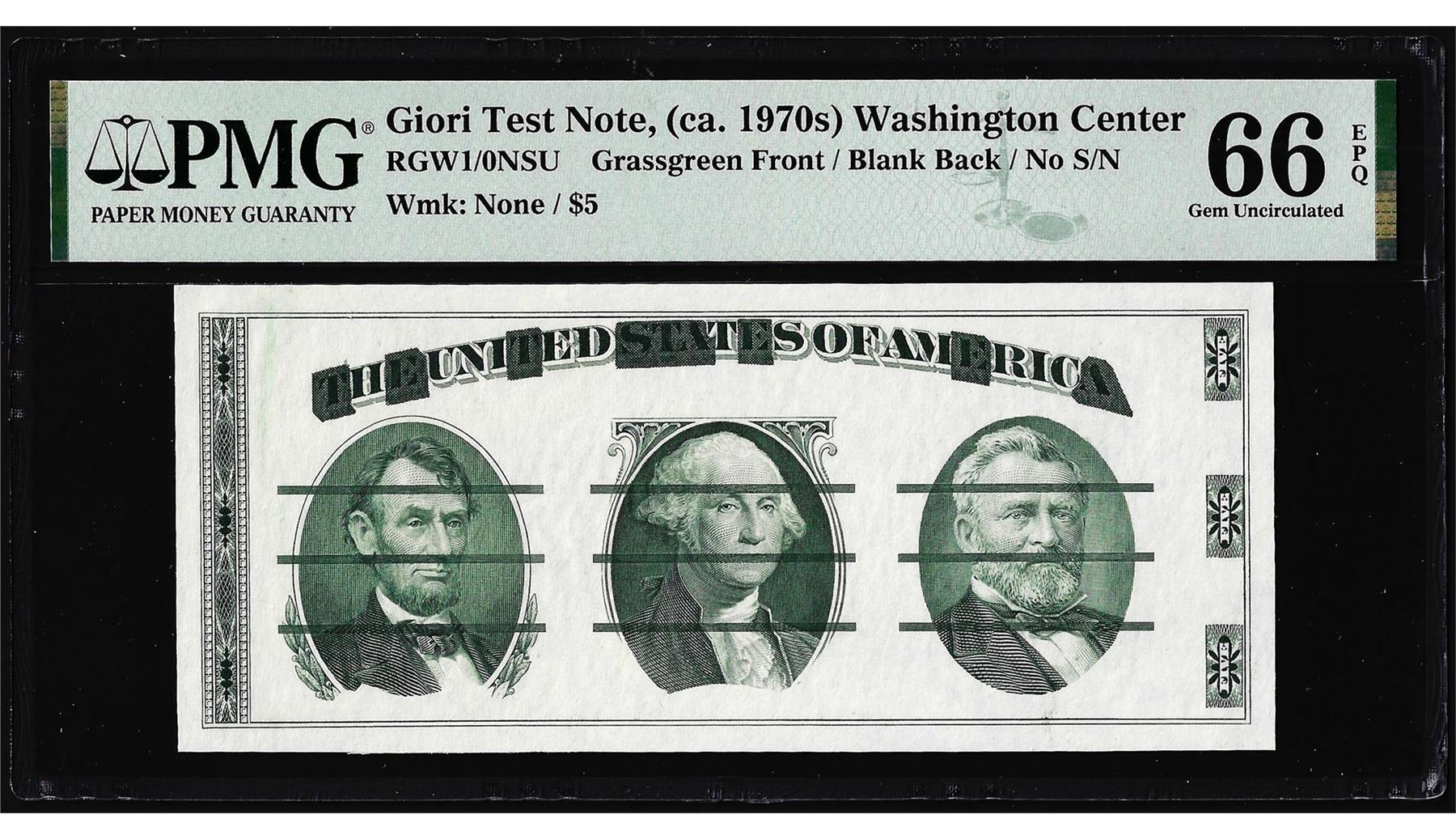 One Circa 1970's Washington Center Giori Test Note PMG Gem Uncirculated 66EPQ. PMG Certified.