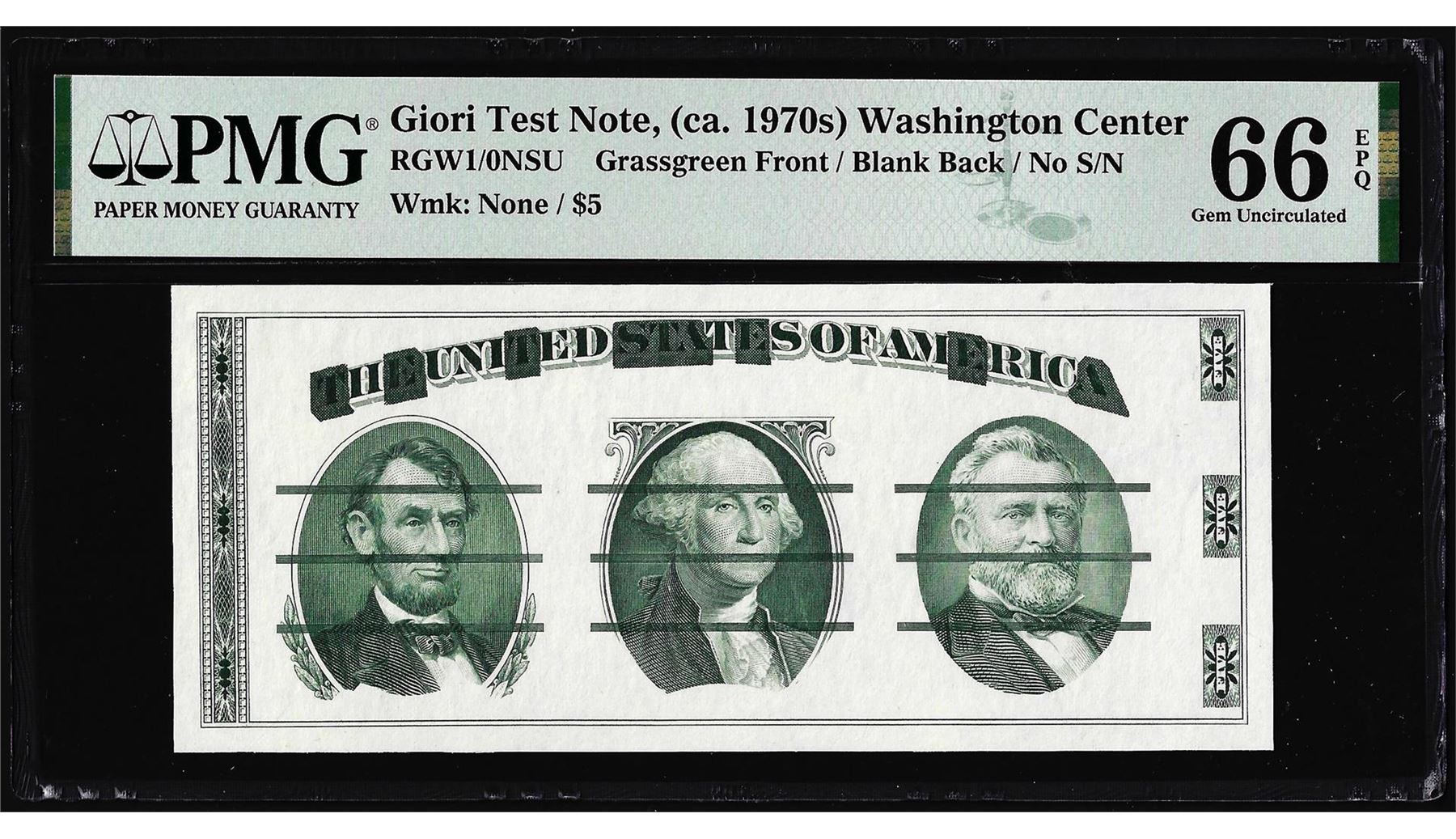 One Circa 1970's Washington Center Giori Test Note PMG Gem Uncirculated 66EPQ. PMG Certified.