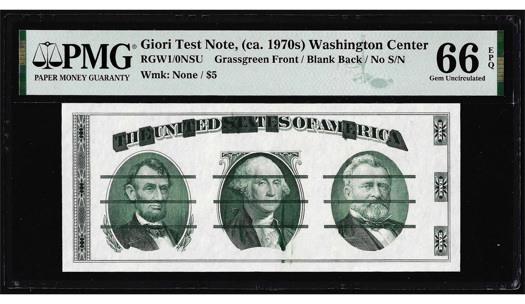 One Circa 1970's Washington Center Giori Test Note PMG Gem Uncirculated 66EPQ. PMG Certified.