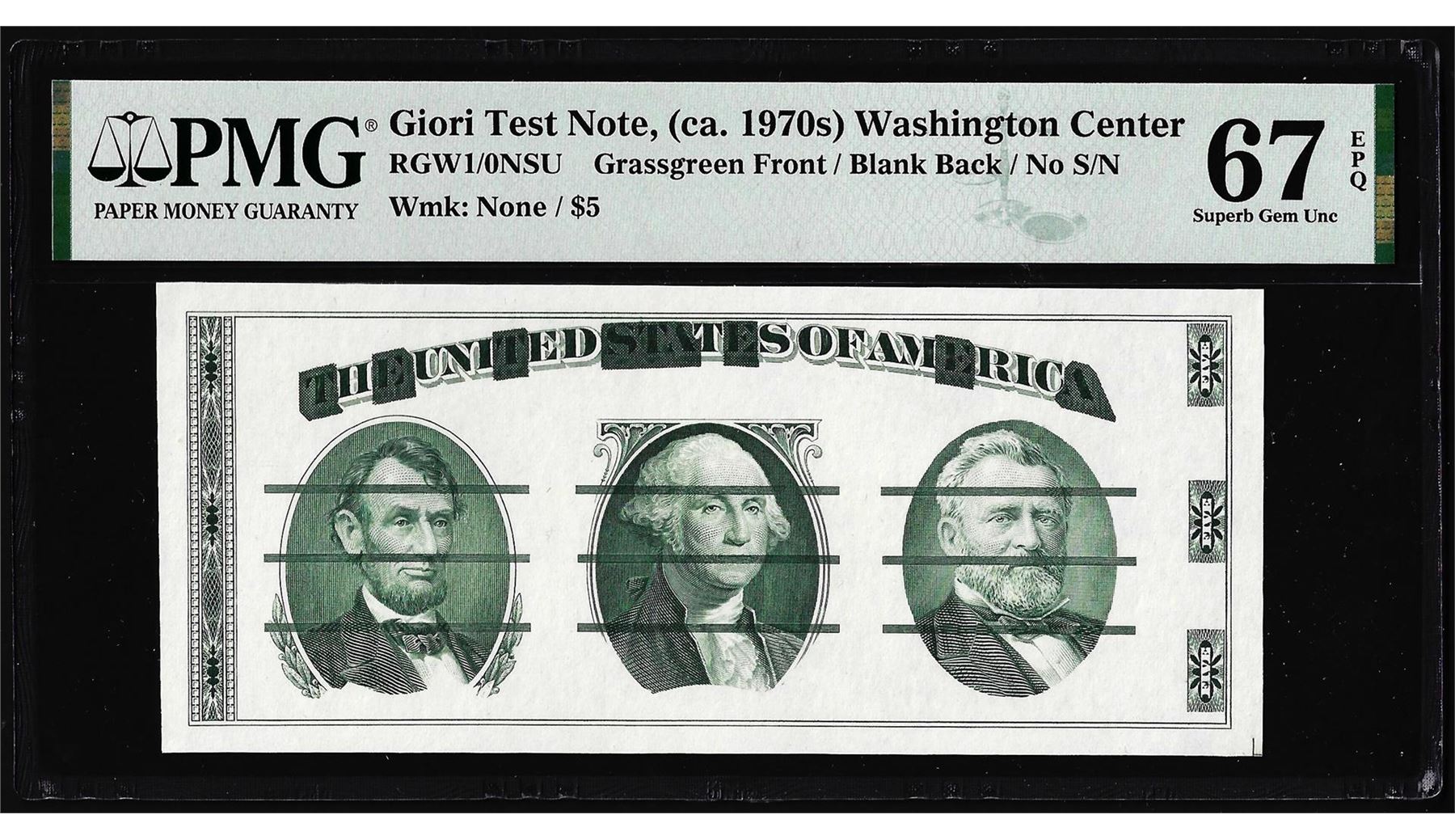 One Circa 1970's Washington Center Giori Test Note PMG Superb Gem Uncirculated 67EPQ. PMG Certified.
