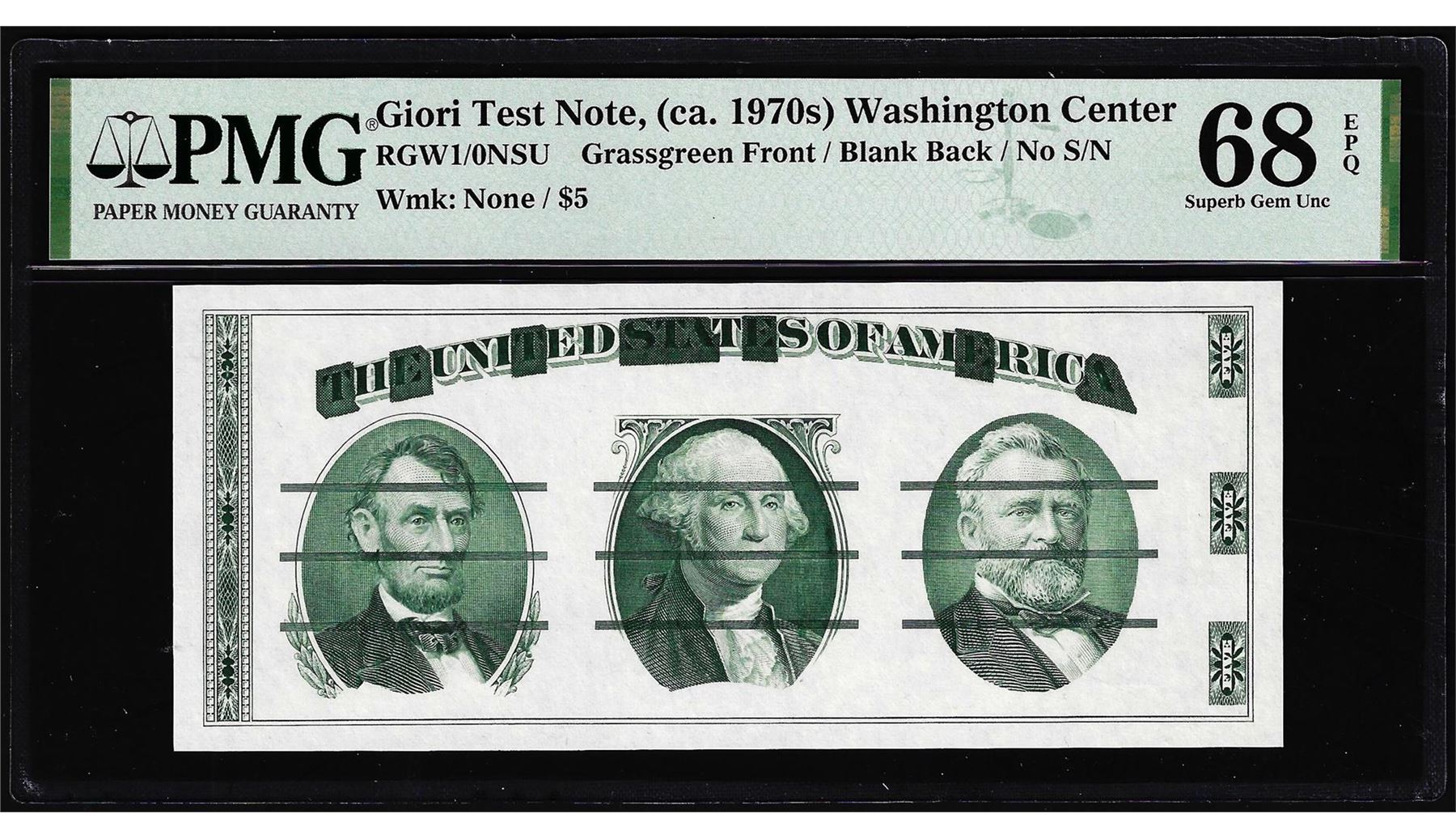 One Circa 1970's Washington Center Giori Test Note PMG Superb Gem Uncirculated 68EPQ. PMG Certified.